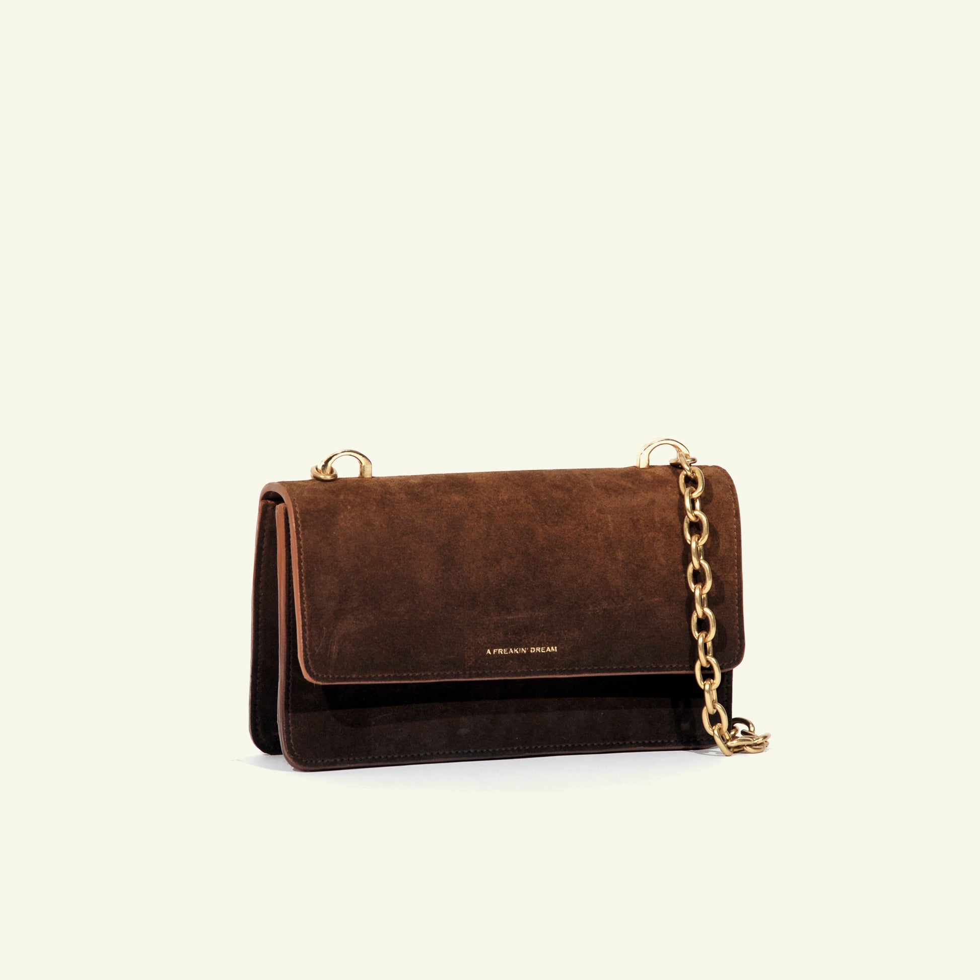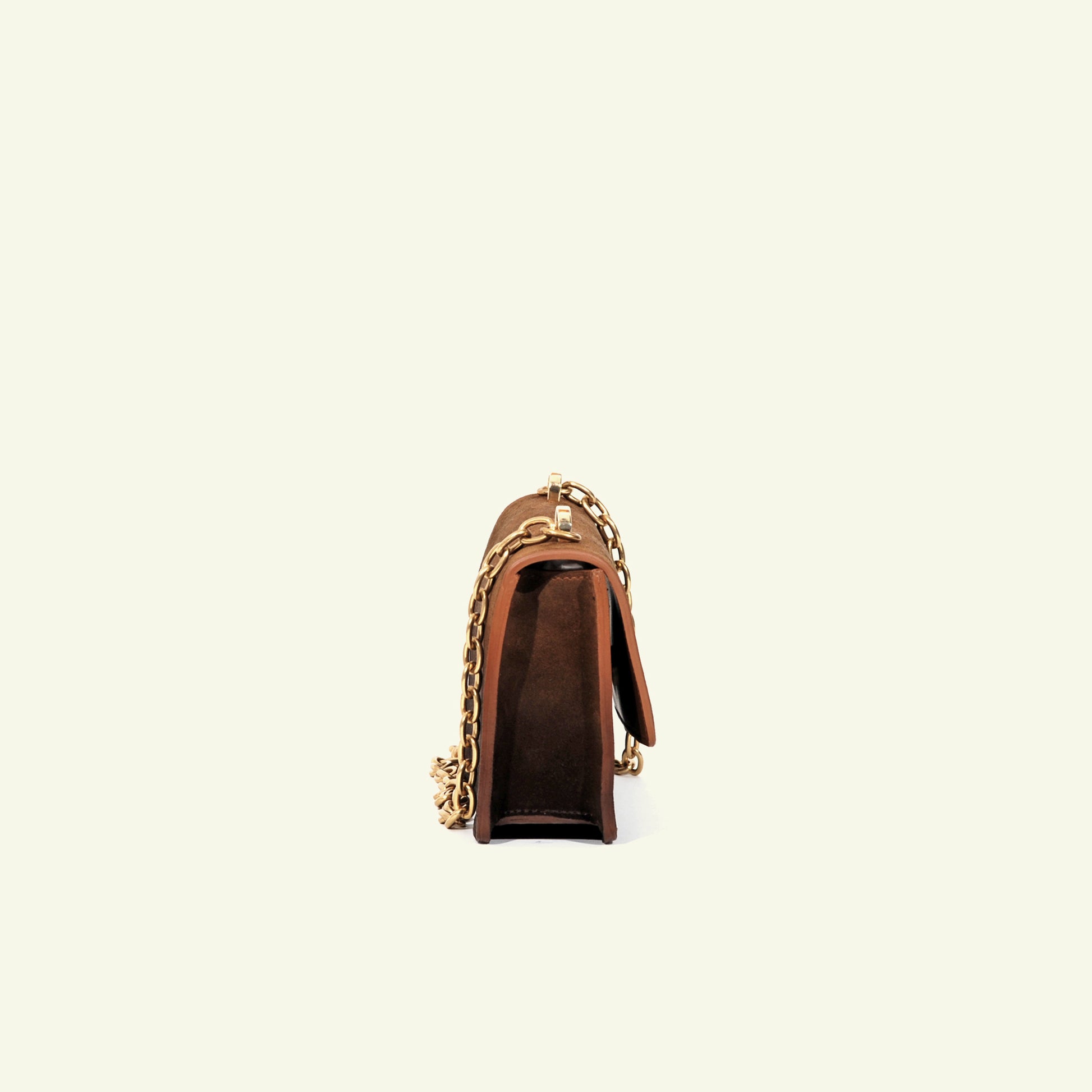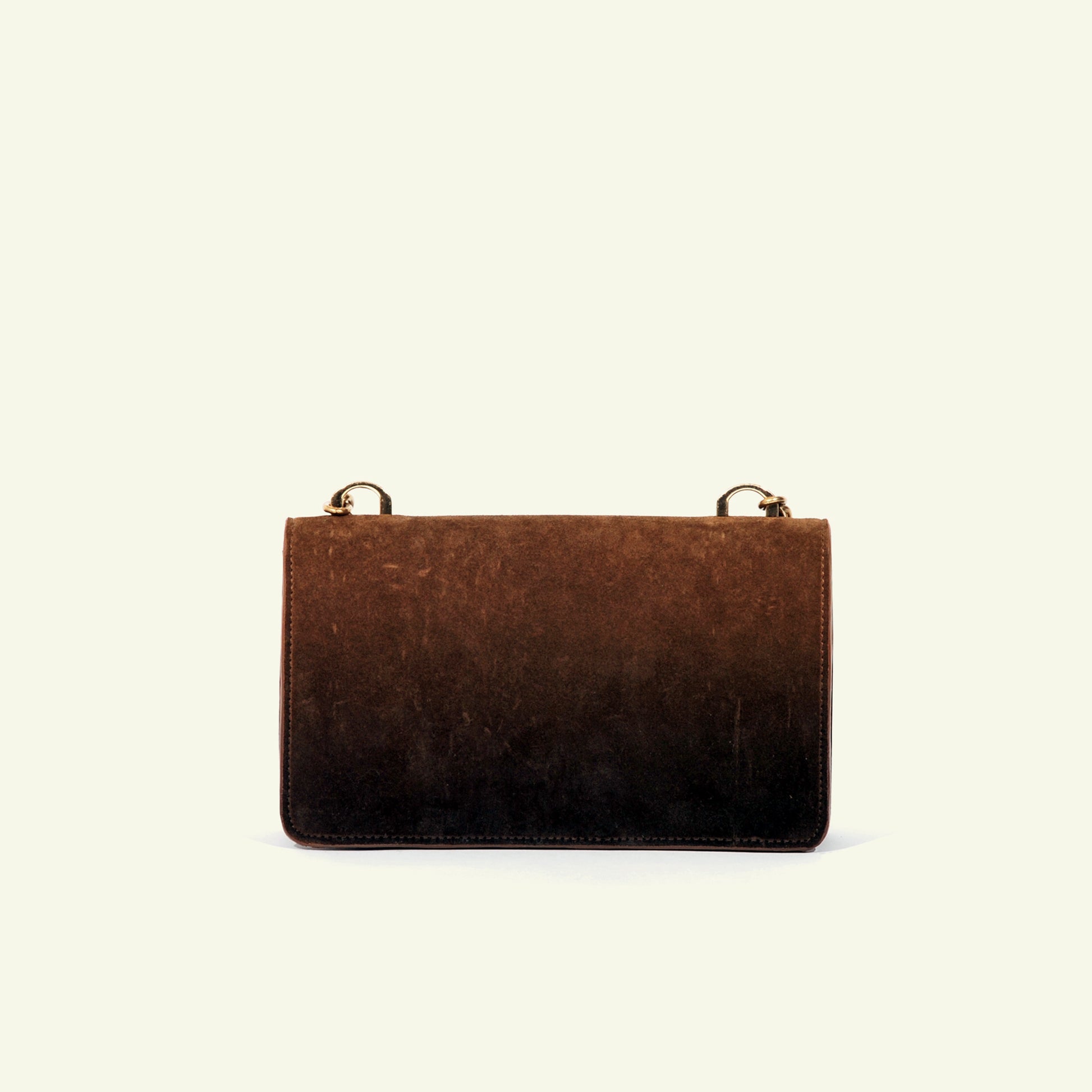 Le sac Brenda en daim de veau aérographié "Burnt Wheat" est un modèle à compartiment unique, doté d’un rabat, d’une fermeture à bouton-pression et d’une bandoulière en chaîne. Réalisé en daim aérographié dans des tons bruns chauds, son dégradé plus foncé partant de la base met en valeur l’ombrage artisanal, lui conférant profondeur et caractère raffiné.