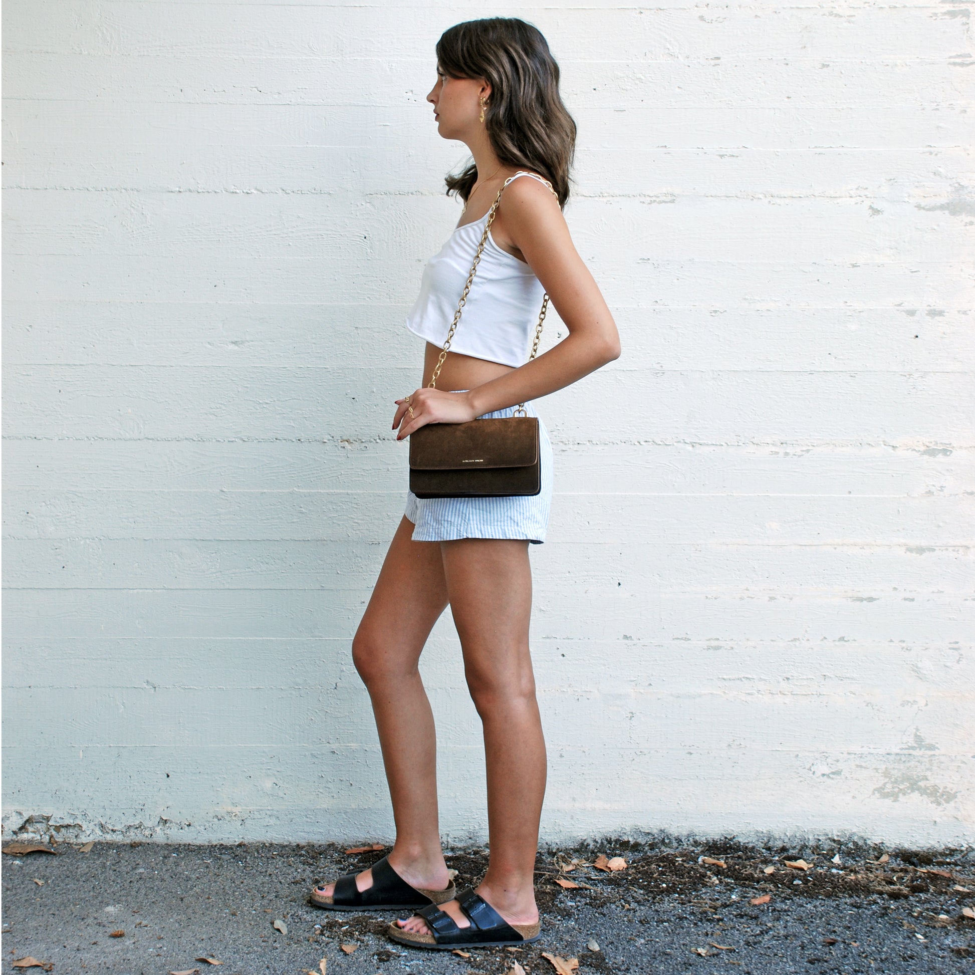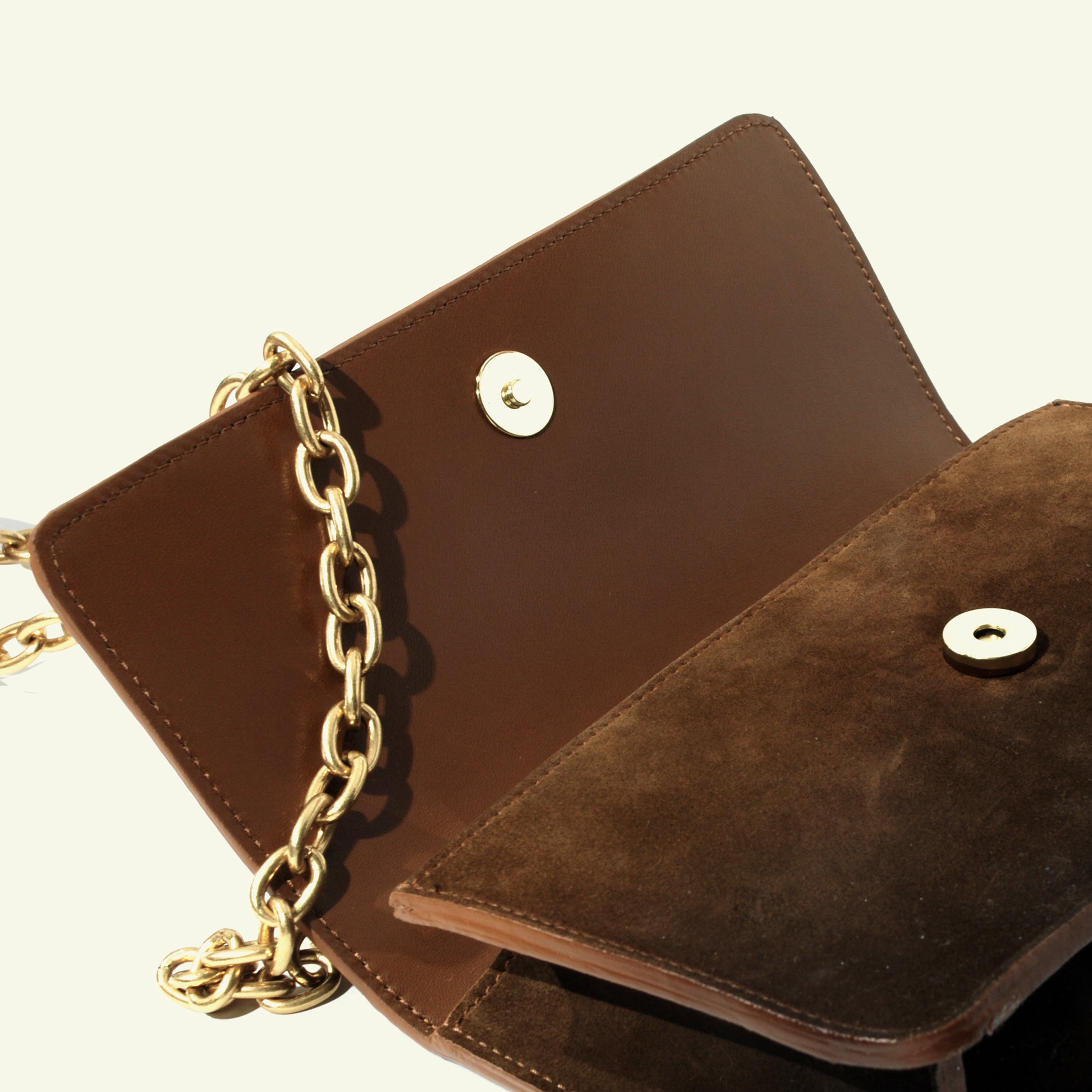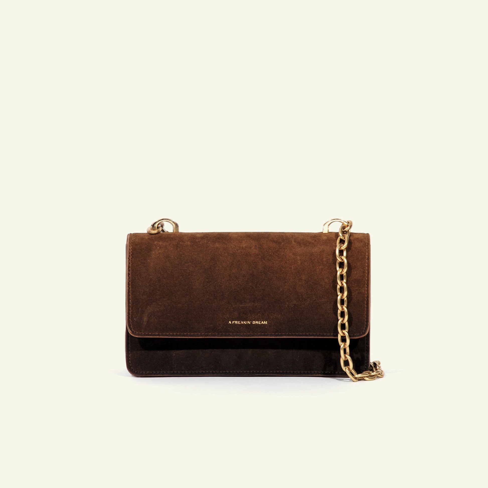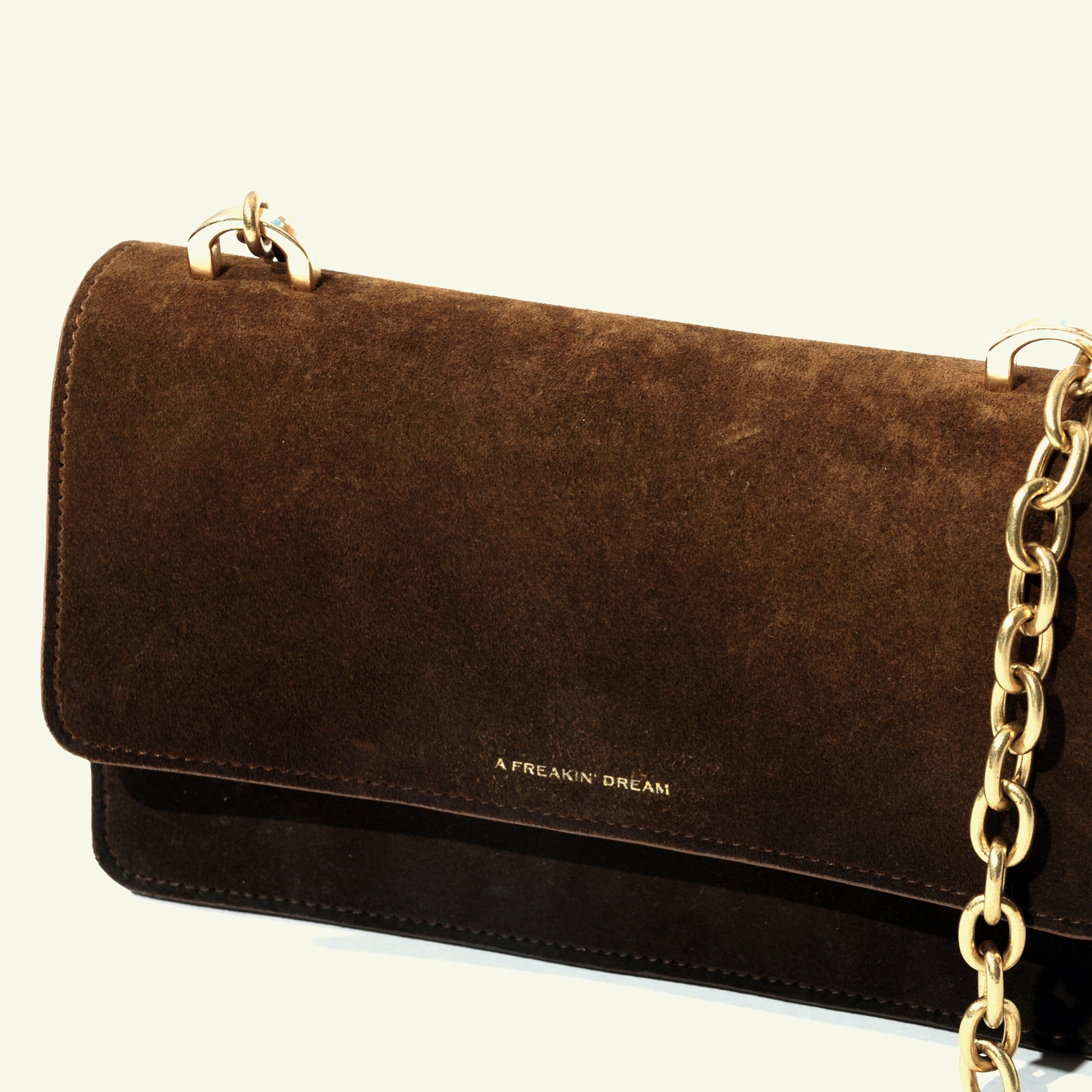 Le sac Brenda en daim de veau aérographié "Burnt Wheat" est un modèle à compartiment unique, doté d’un rabat, d’une fermeture à bouton-pression et d’une bandoulière en chaîne. Réalisé en daim aérographié dans des tons bruns chauds, son dégradé plus foncé partant de la base met en valeur l’ombrage artisanal, lui conférant profondeur et caractère raffiné.