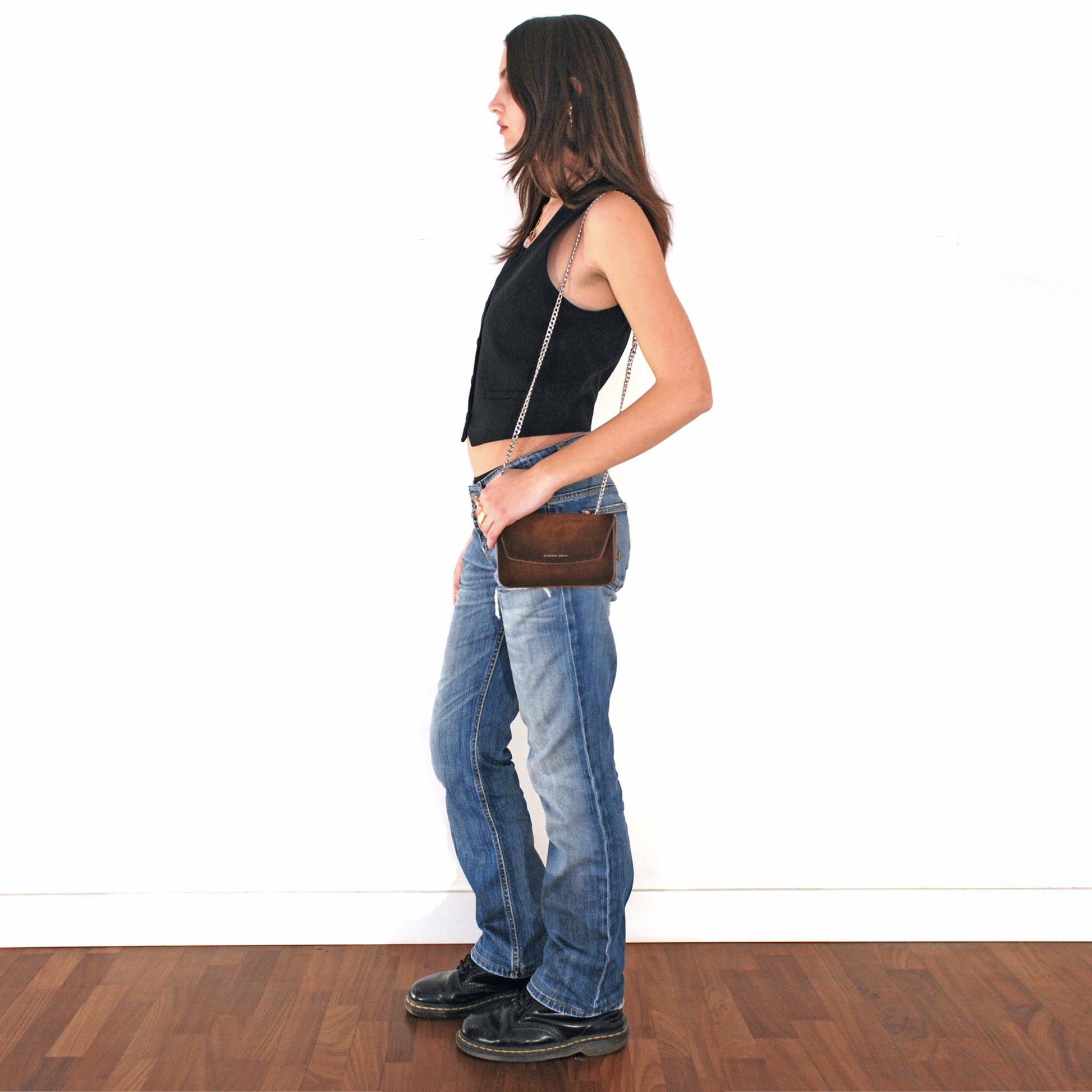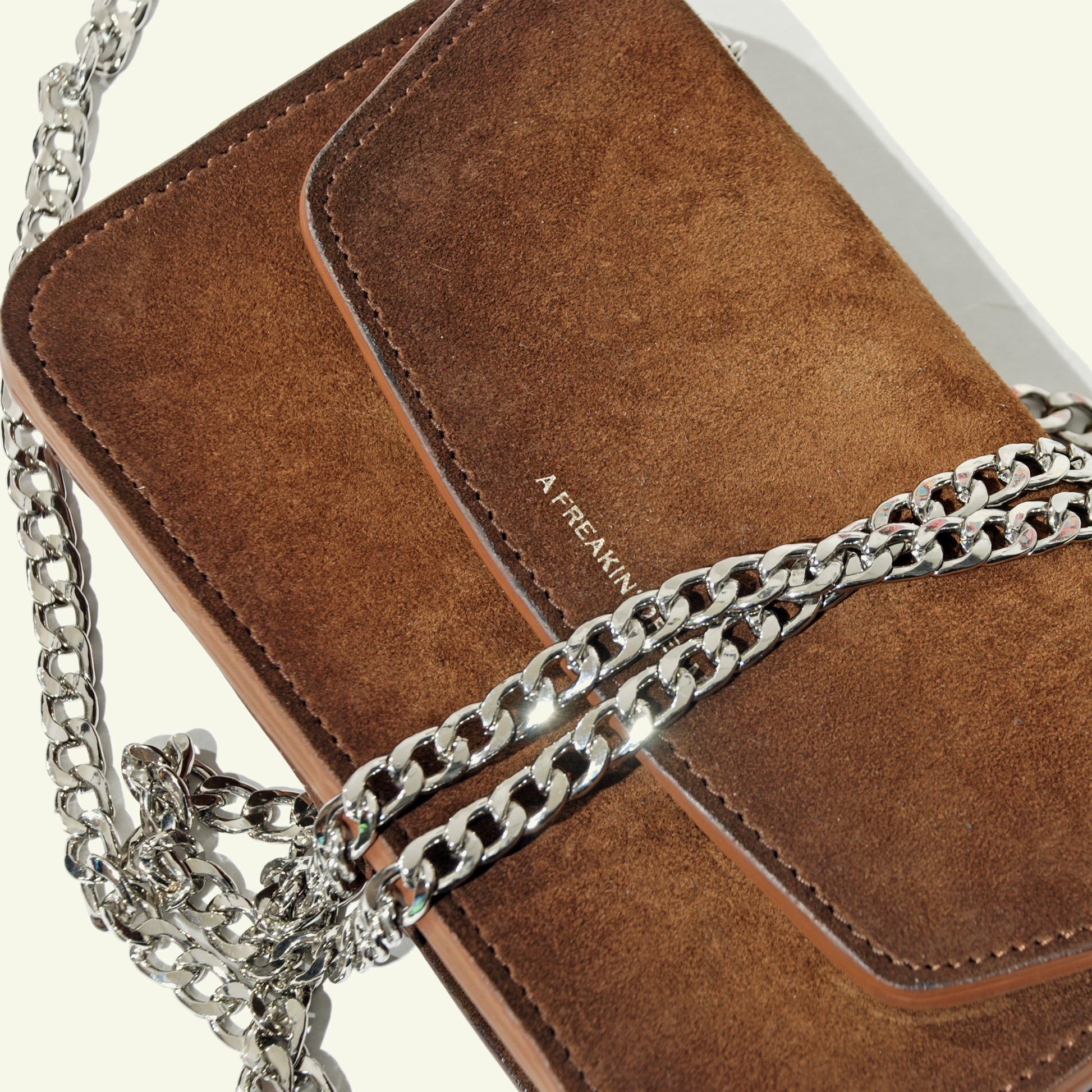 Sa silhouette compacte et sa bandoulière chaîne lui confèrent une polyvalence moderne, passant aisément du jour à la nuit.