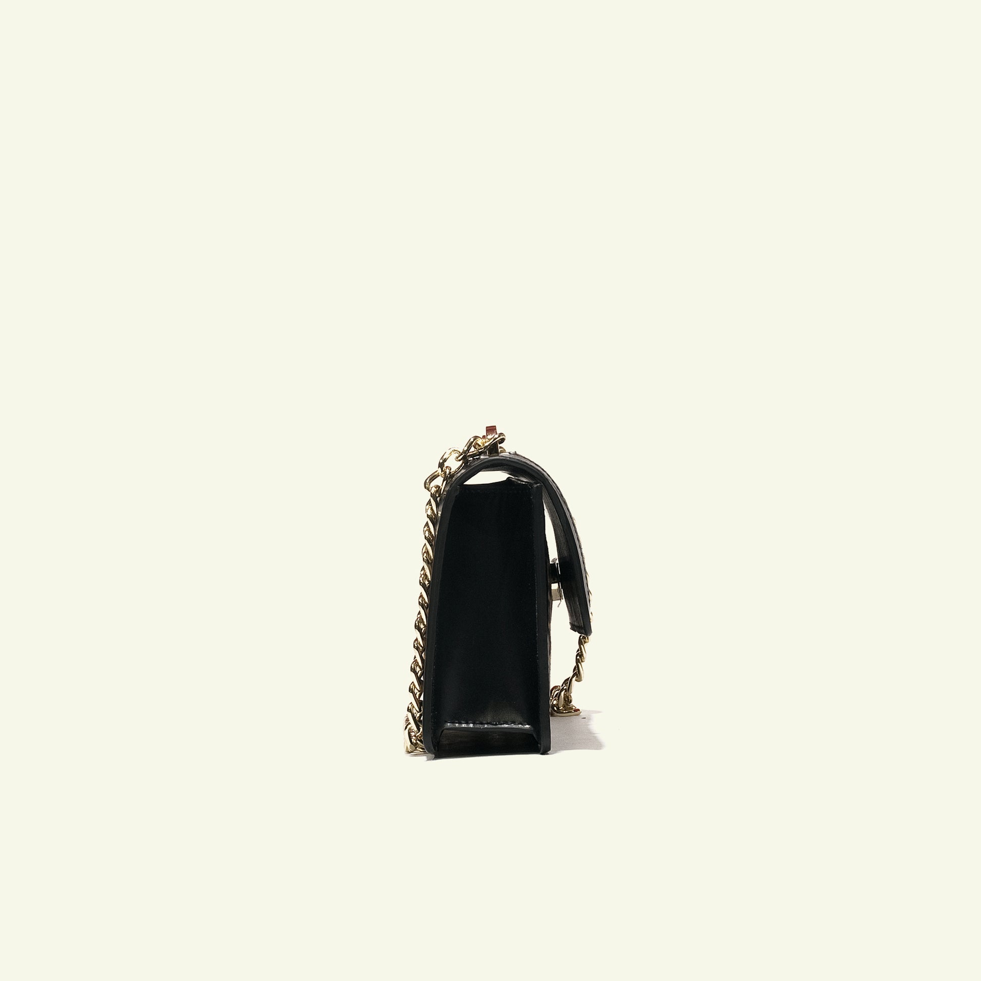 Il contrasto tra la texture decisa del cavallino e la struttura pulita del vitello nero definisce l’identità della borsa, mentre la tracolla a catena in metallo consente l’uso a spalla o crossbody.