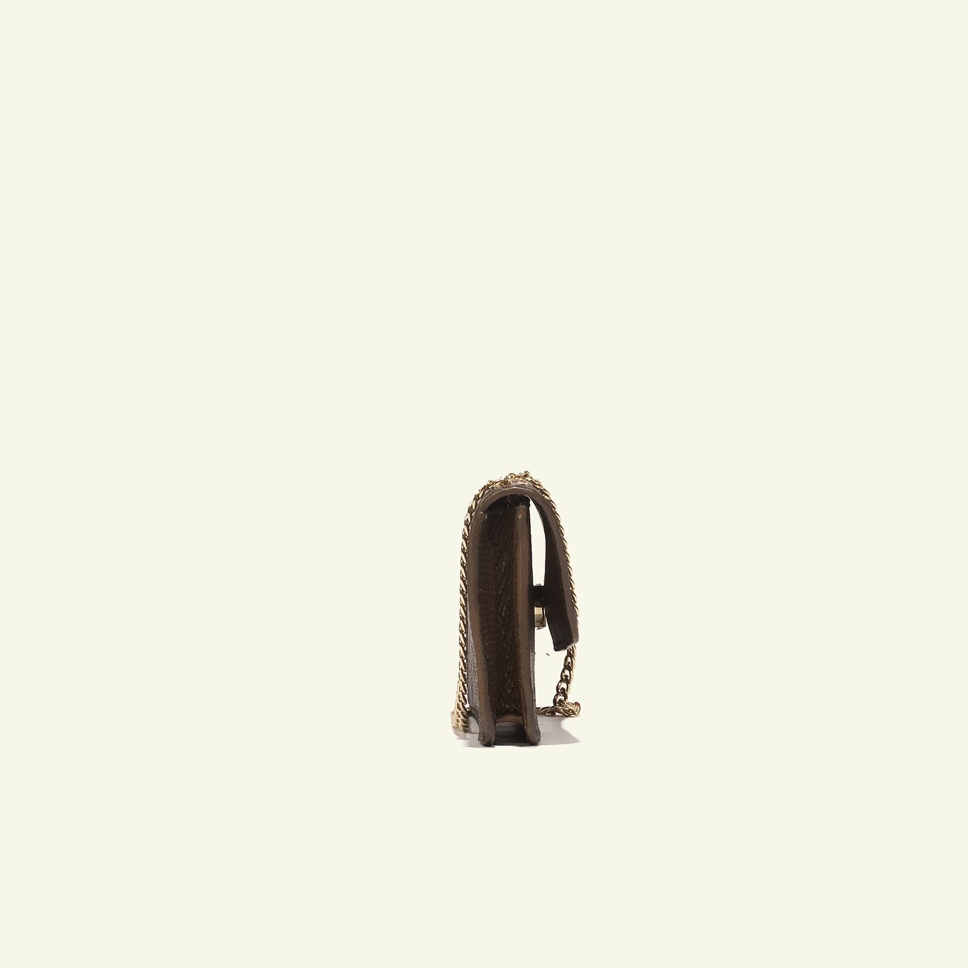La silhouette compatta è completata da una tracolla a catena in metallo e da una chiusura con pattina magnetica, bilanciando struttura e versatilità quotidiana.