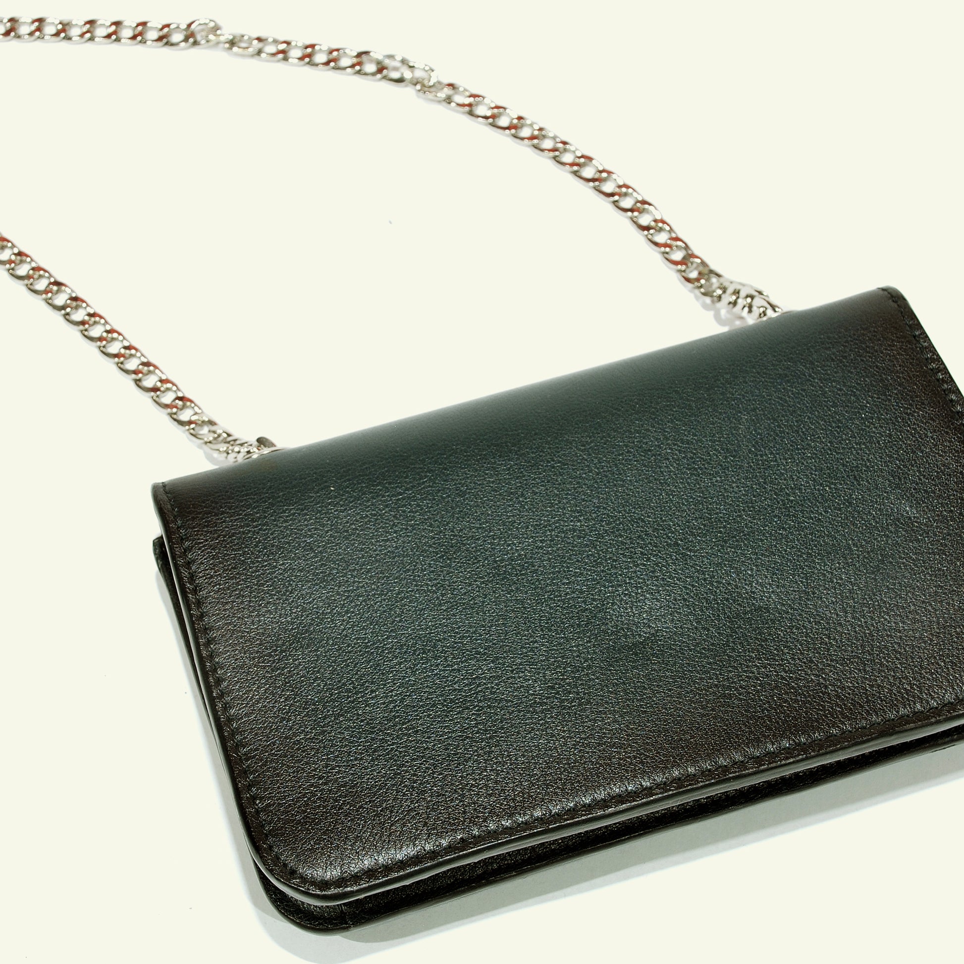 La silhouette compatta è completata da una tracolla a catena in metallo e da una chiusura con pattina magnetica, bilanciando eleganza senza tempo e funzionalità quotidiana.