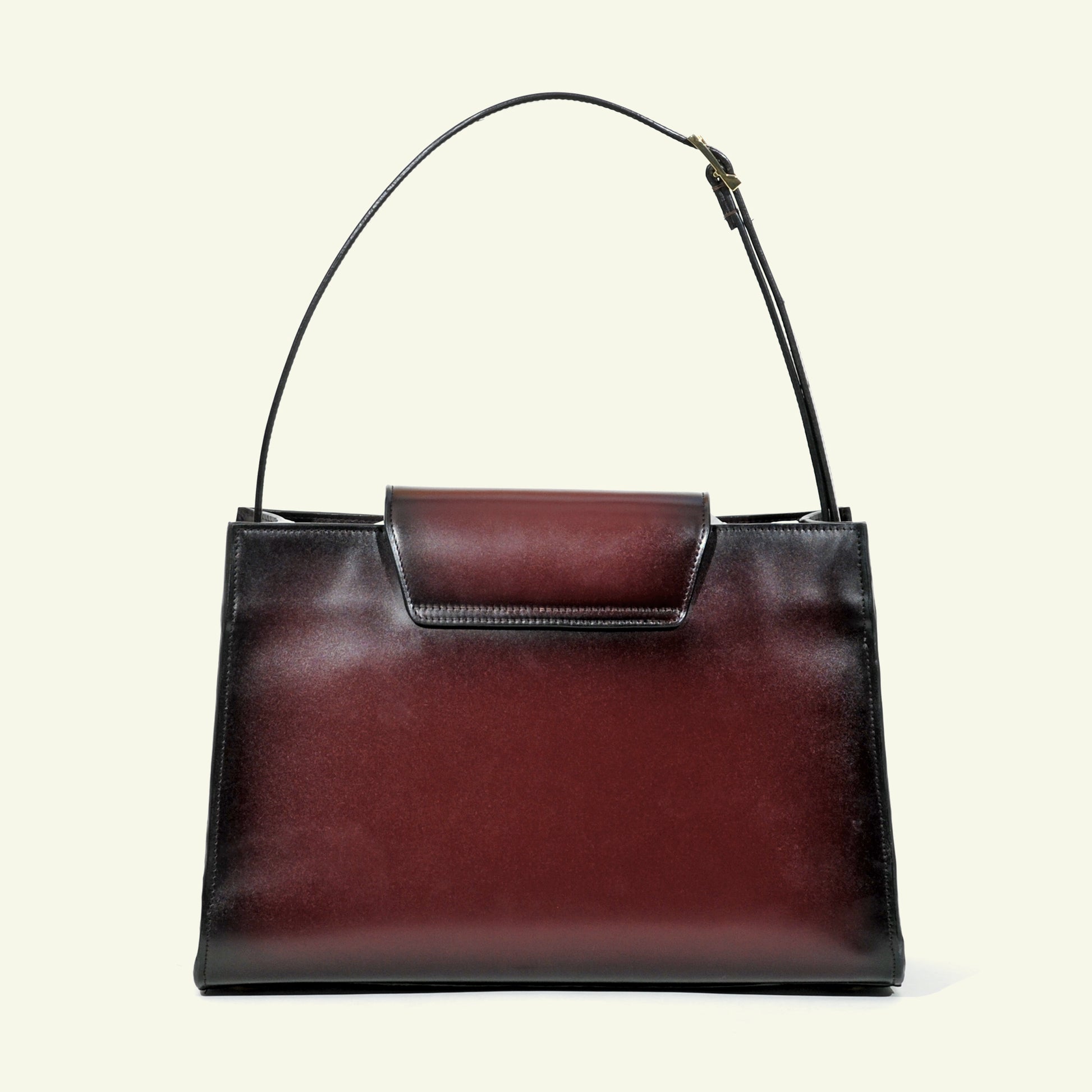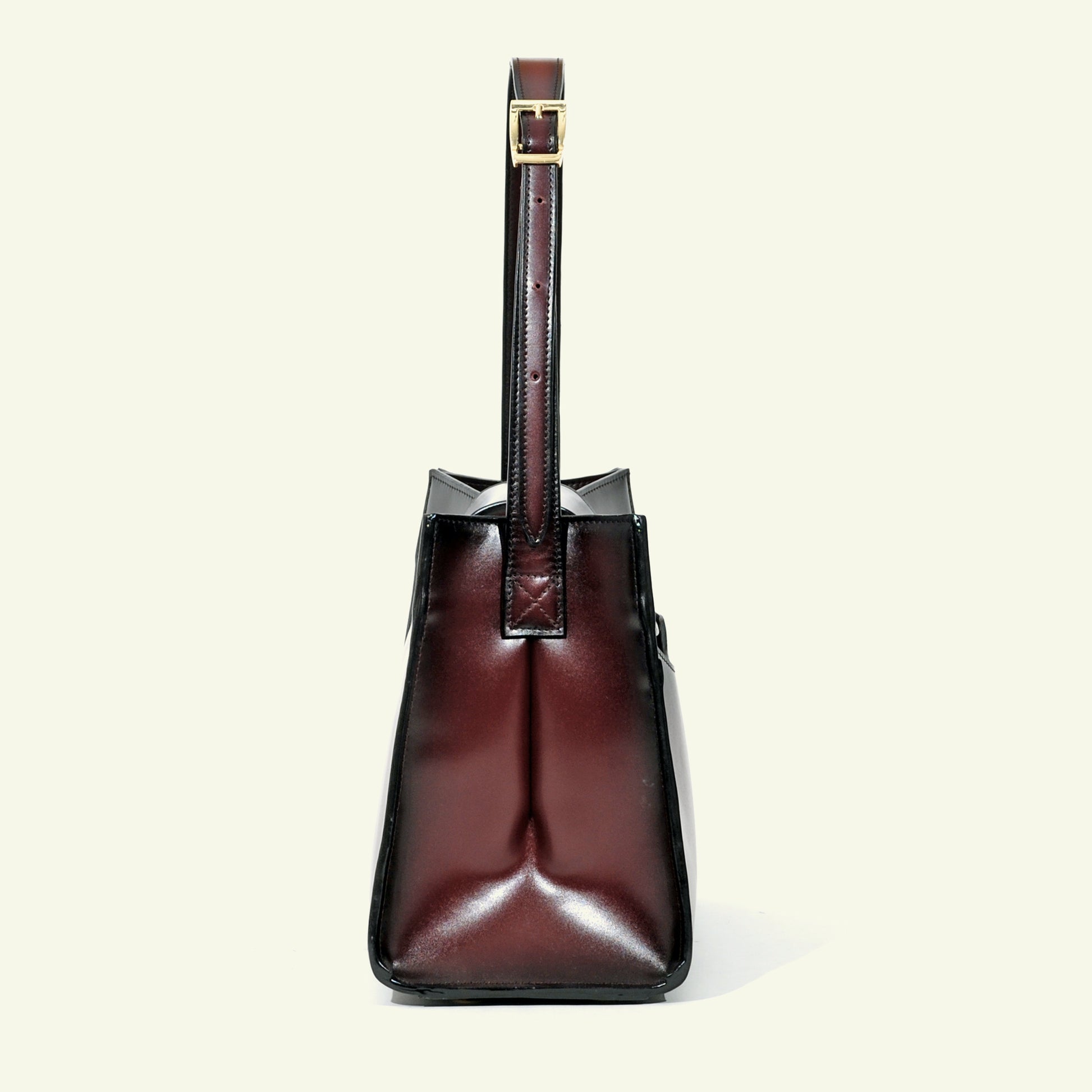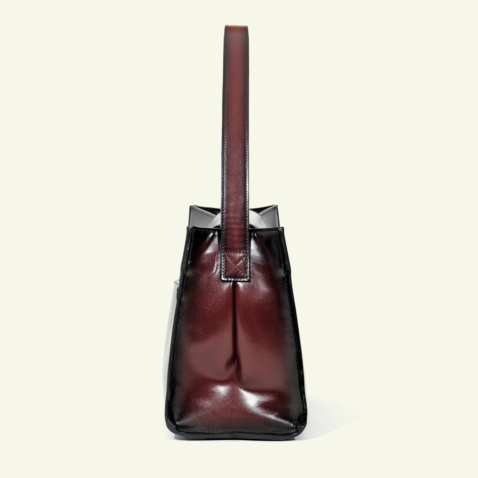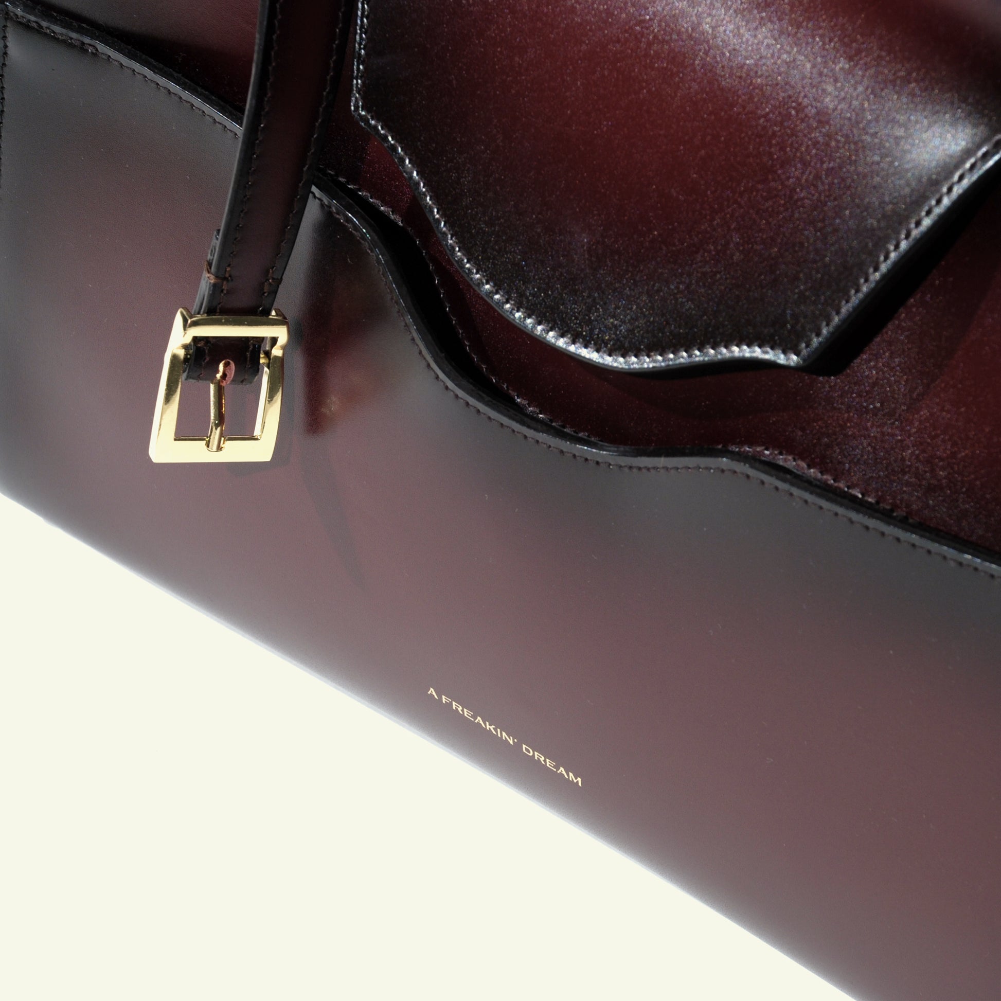 Realizzata a mano a Firenze, presenta tonalità bordeaux profonde con lievi sfumature tonali che valorizzano la sua ampia silhouette ispirata alla shopper.