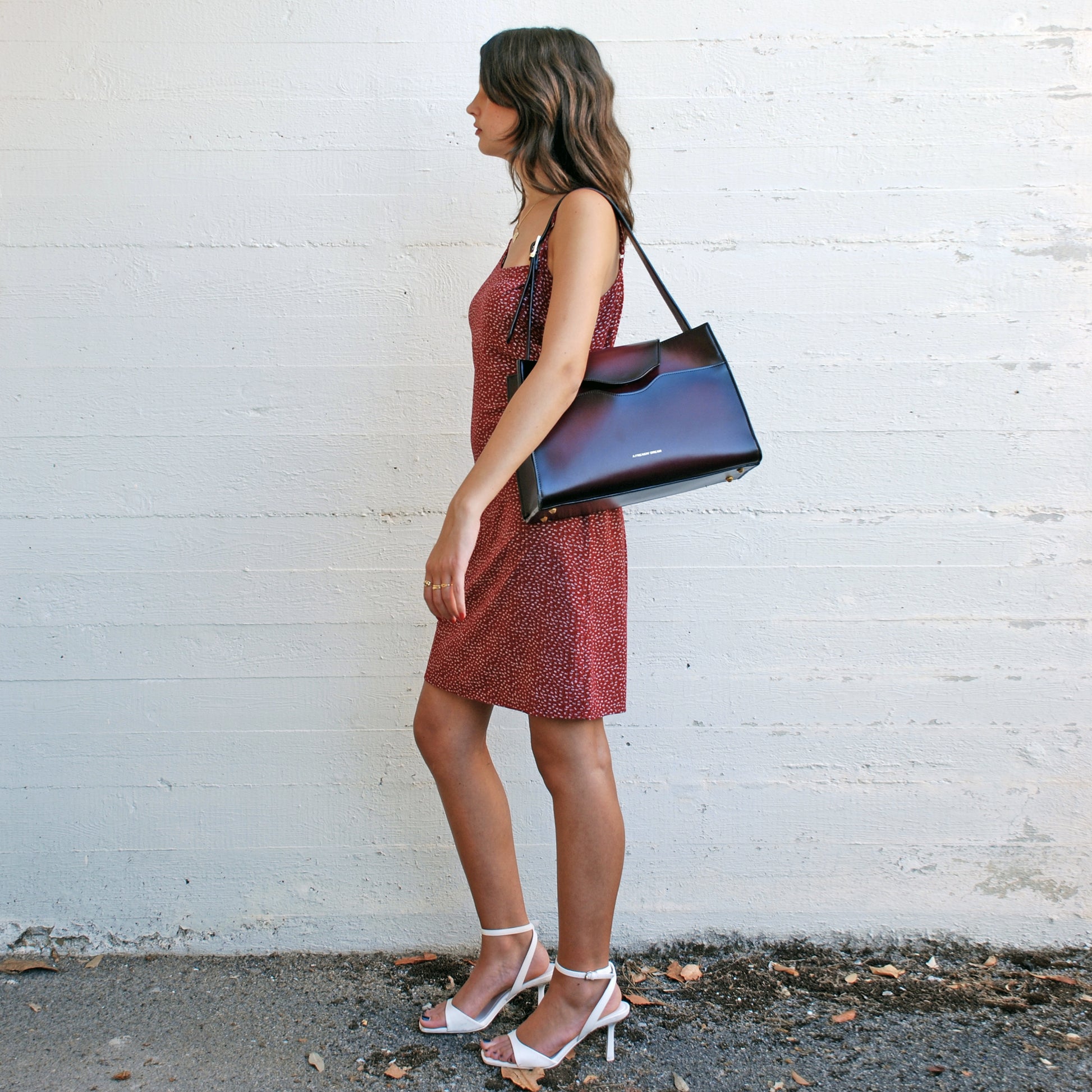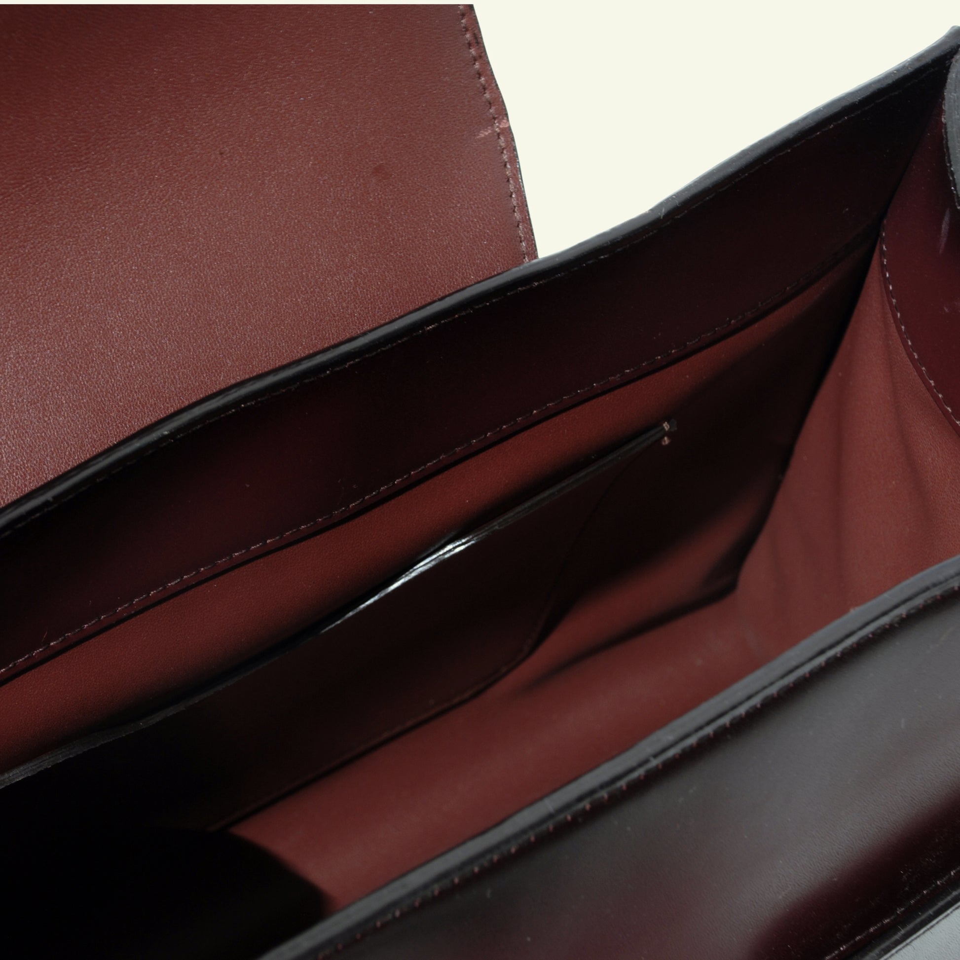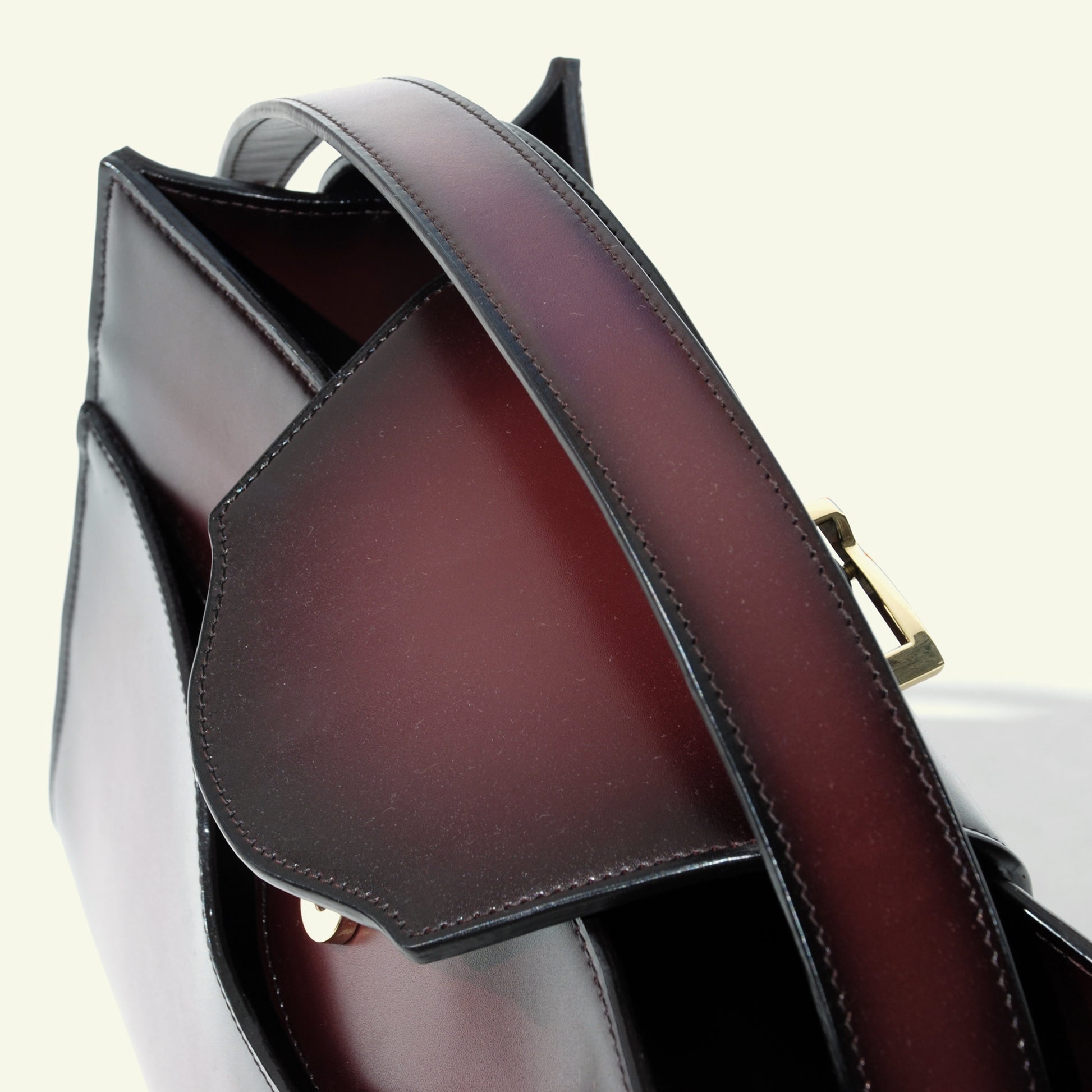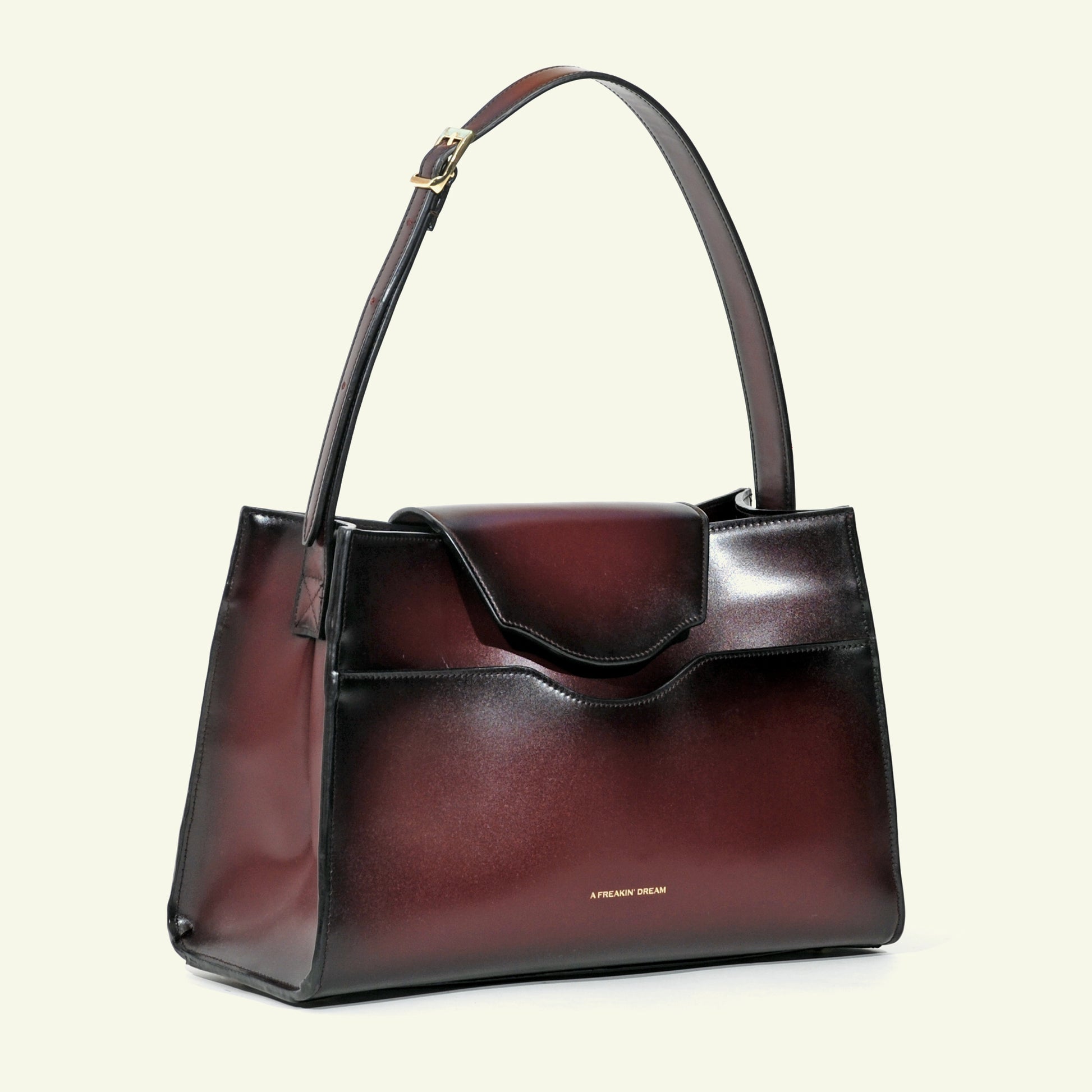 Realizzata a mano a Firenze, presenta tonalità bordeaux profonde con lievi sfumature tonali che valorizzano la sua ampia silhouette ispirata alla shopper.