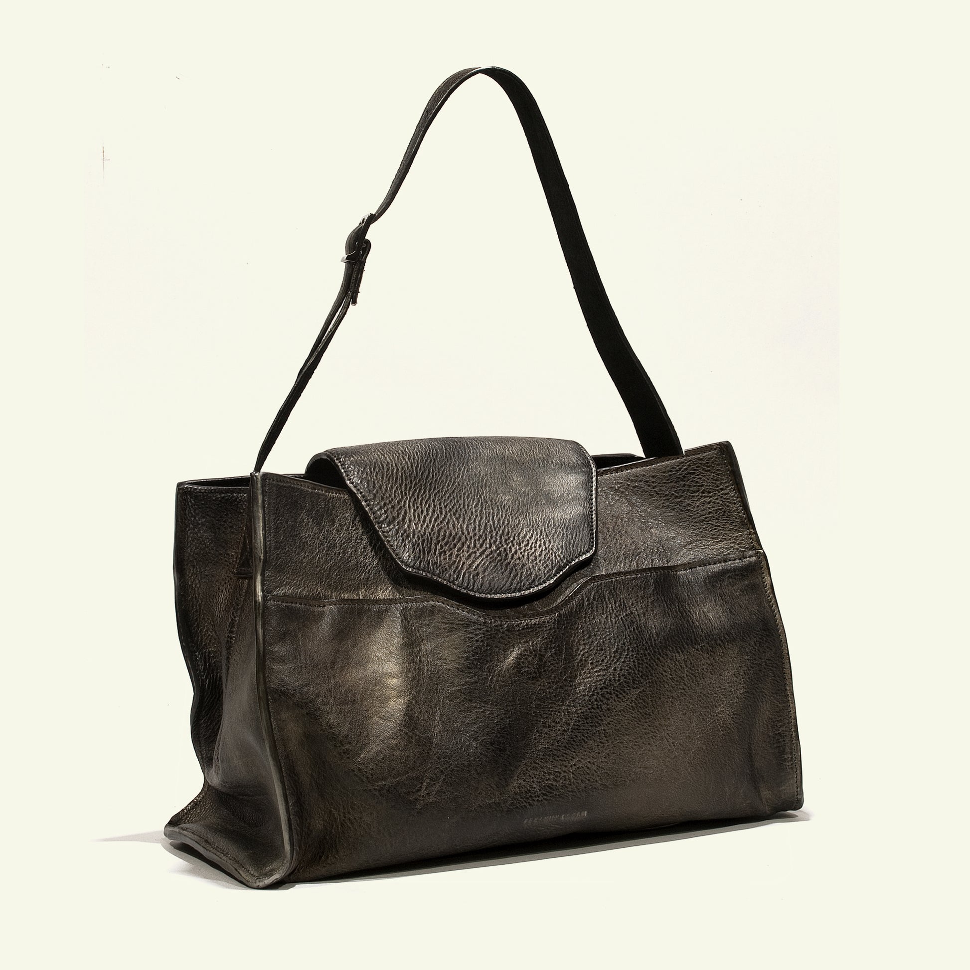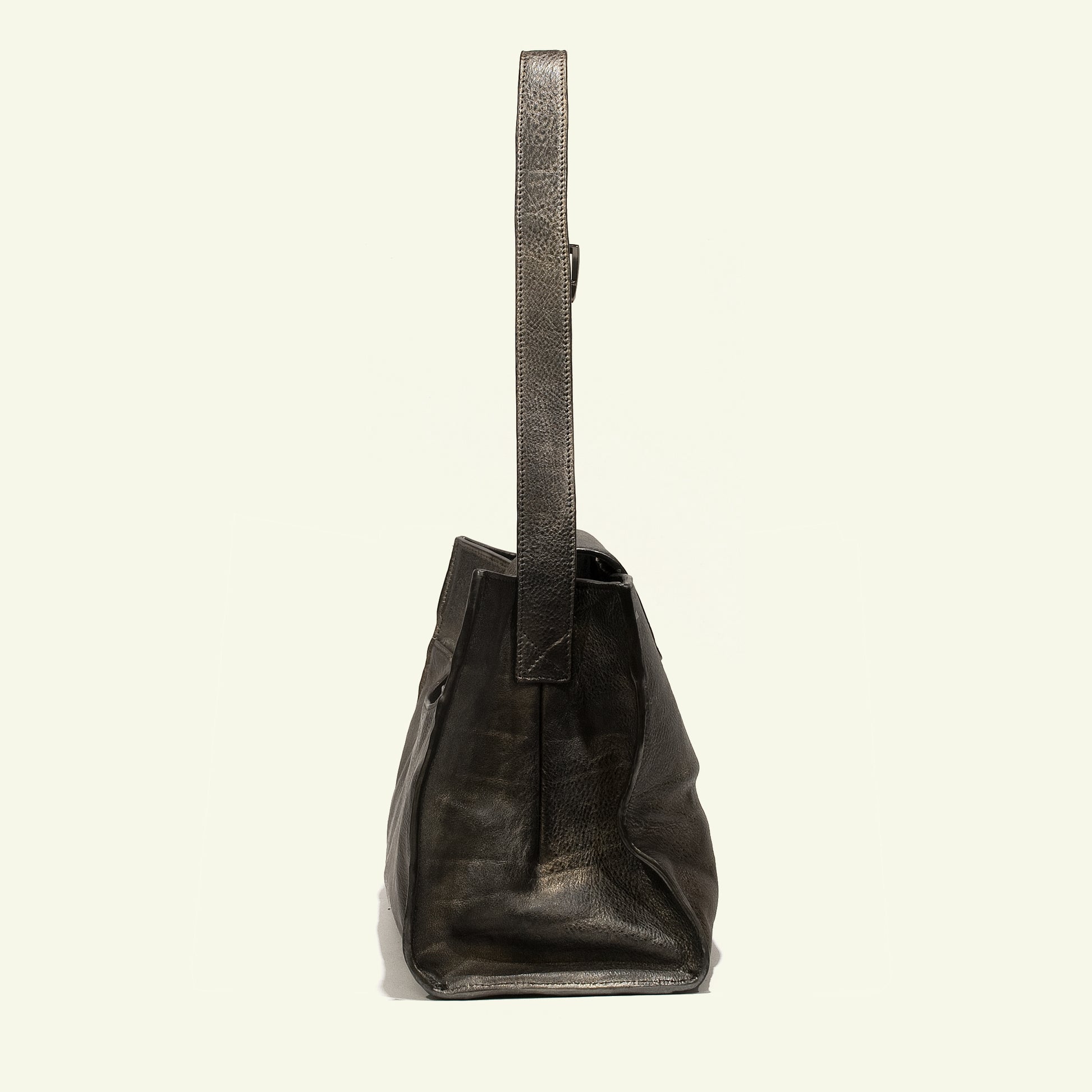 Realizzata in vitello rifinito a mano, questa borsa è definita da una costruzione rilassata, linee pulite ed eleganza misurata. La tracolla regolabile consente una vestibilità versatile, mentre la chiusura con bottone a pressione mantiene il design essenziale e funzionale.