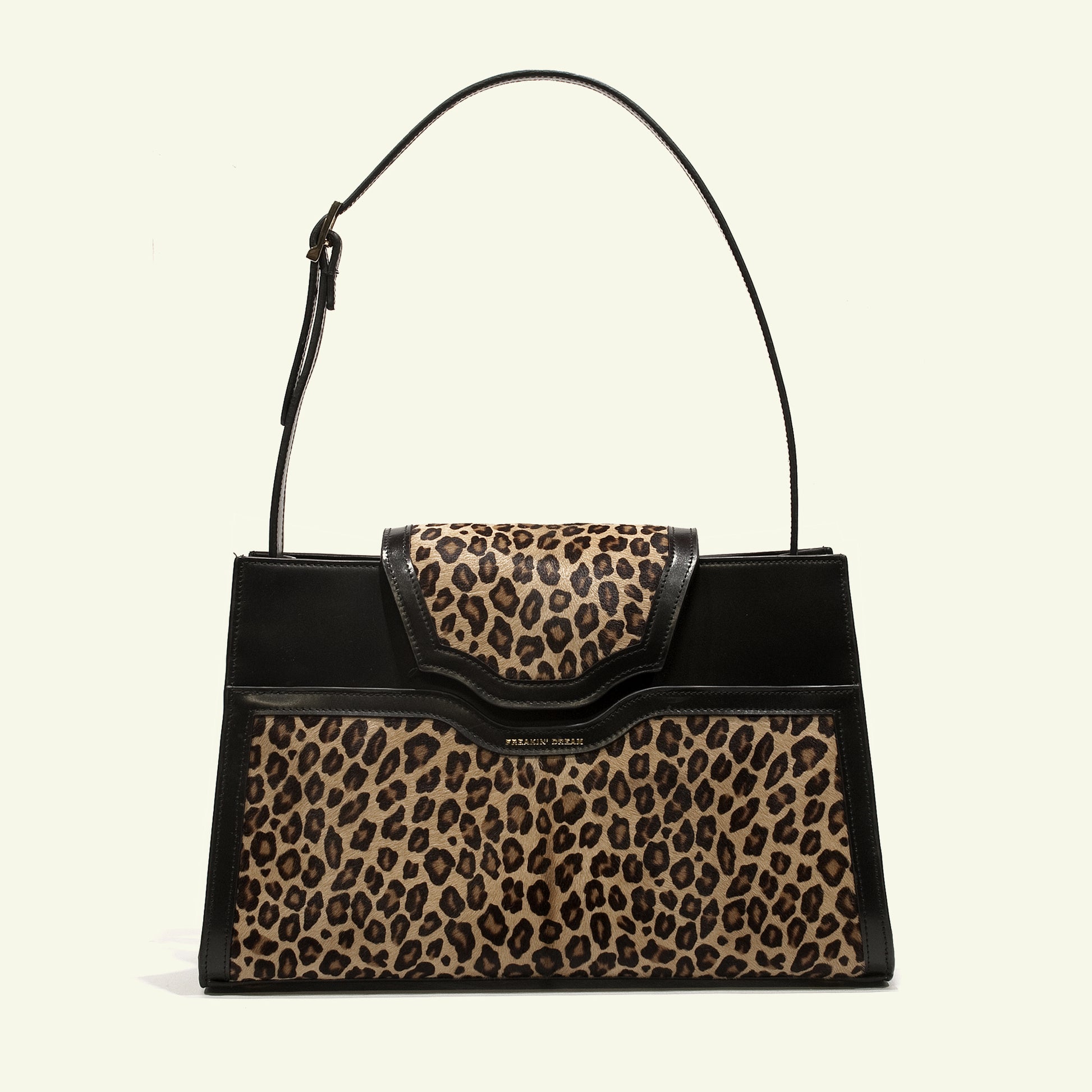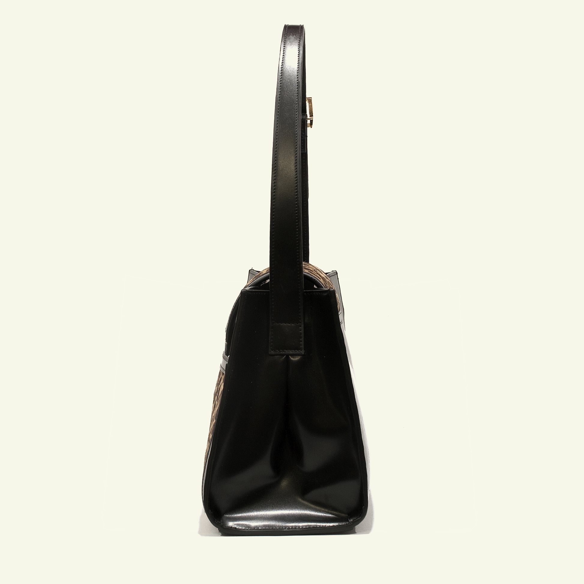 Realizzata a mano a Firenze come pezzo unico, combina cavallino stampato leopardato e vitello nero liscio, creando un contrasto raffinato tra texture e struttura.