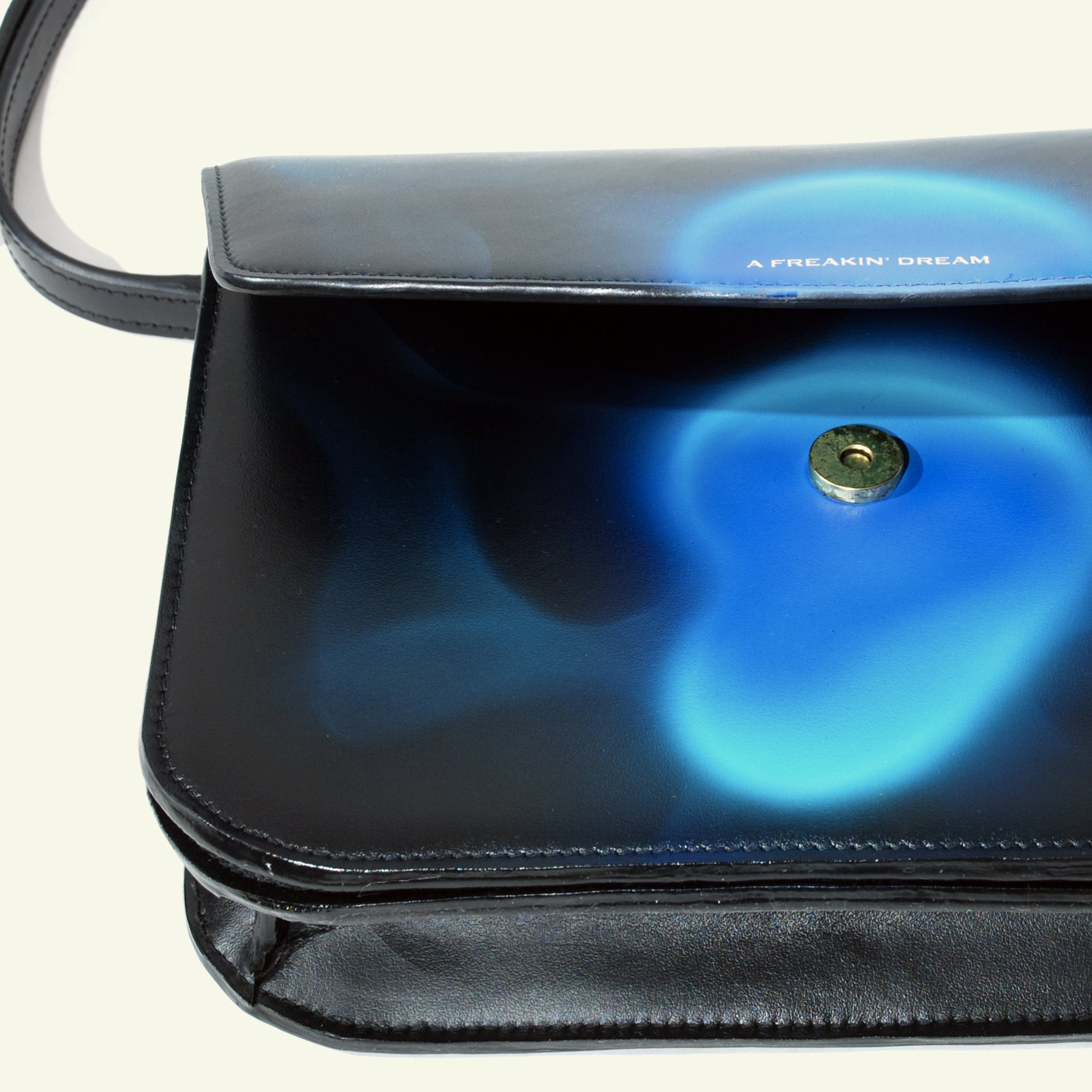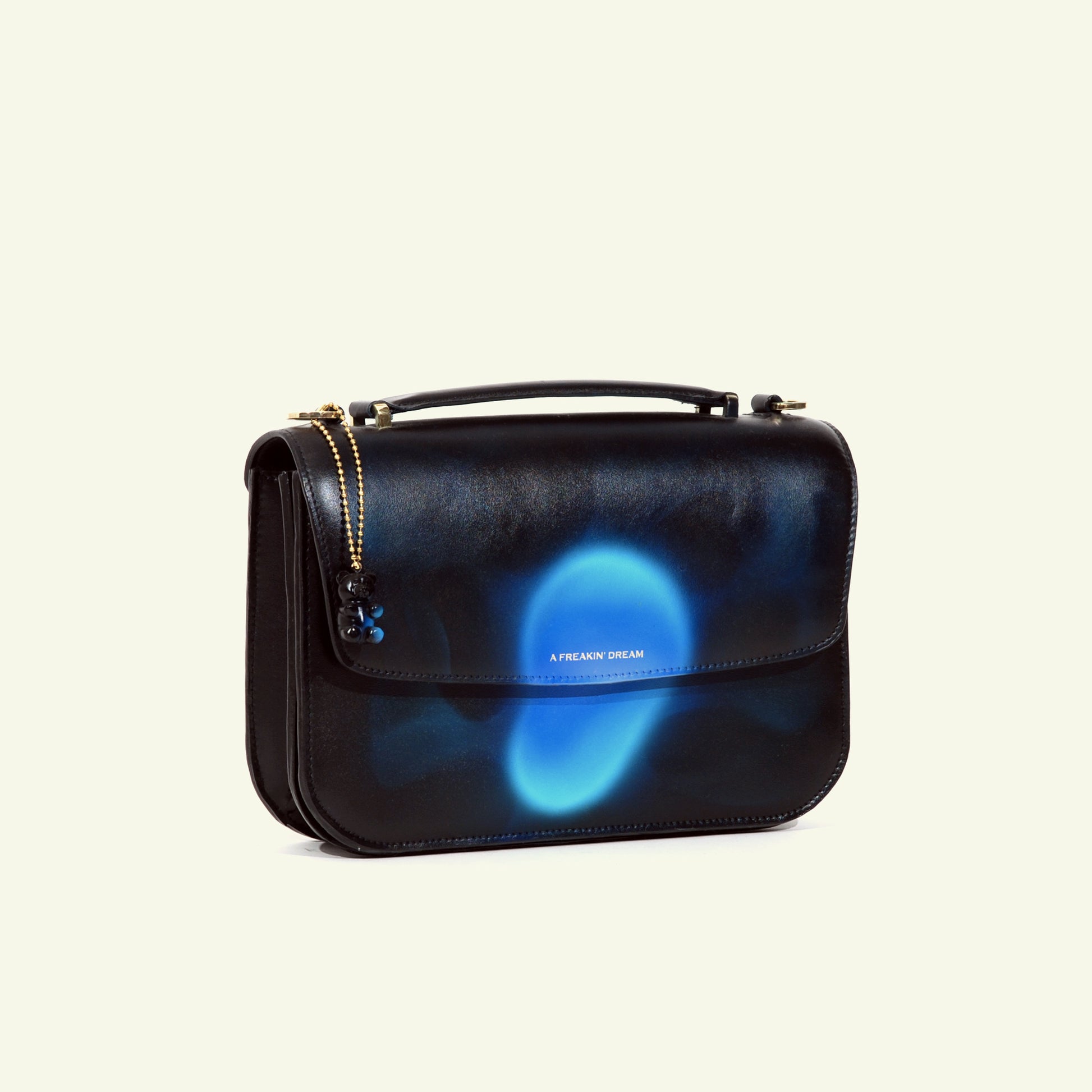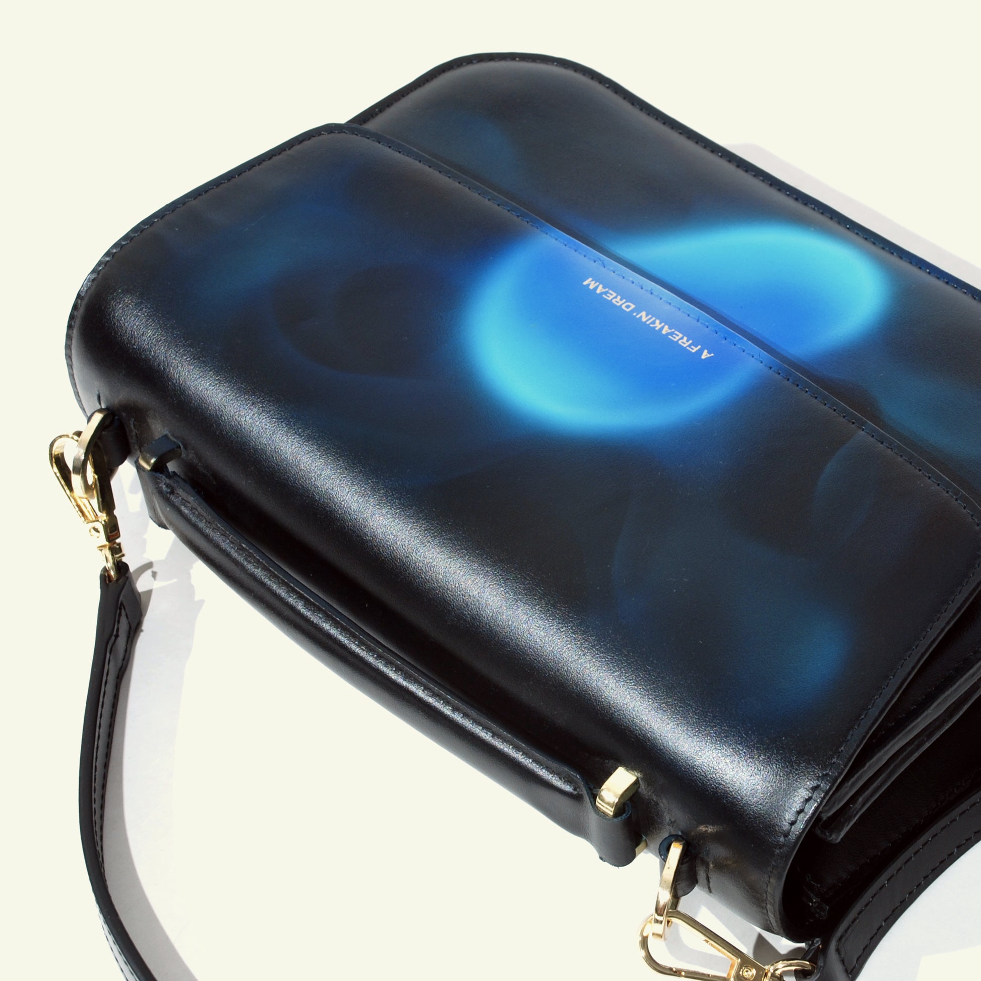 Su una base in pelle nera, la superficie è aerografata a mano con un motivo blu intenso ispirato agli elettroni, che irradia energia e movimento.