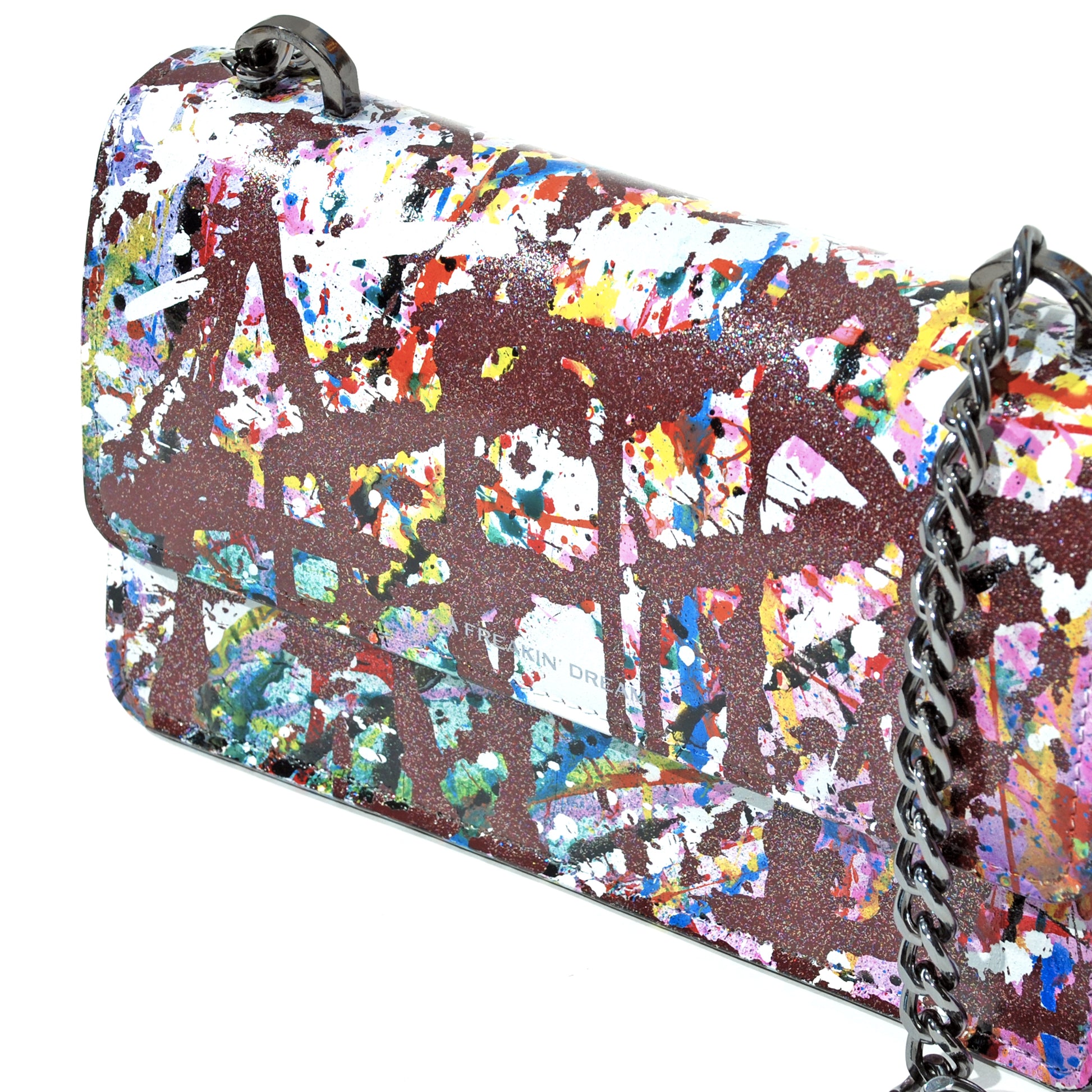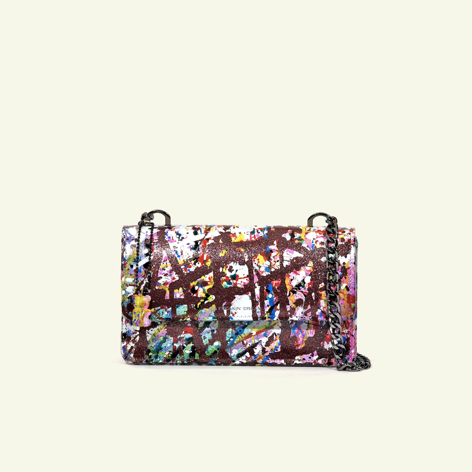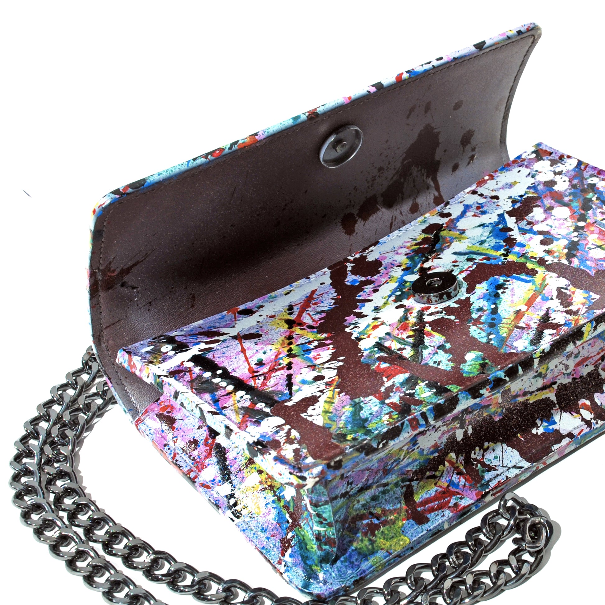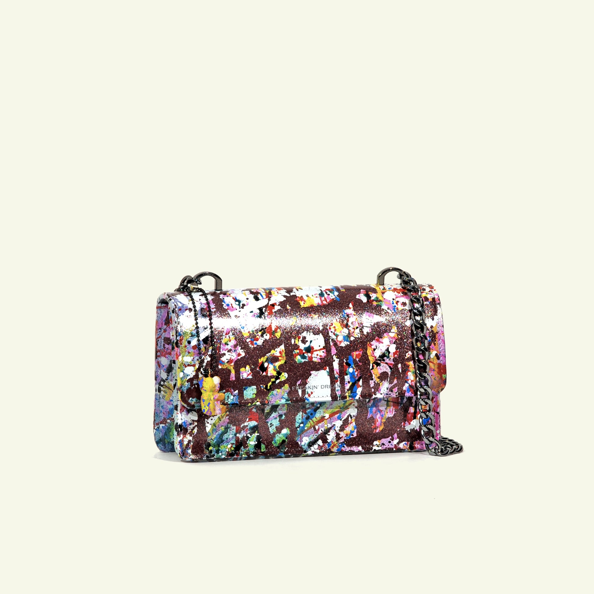 Realizzata in pelle aerografata a mano con stratificazioni multicolor, presenta una base bordeaux con dettagli metallici che esaltano la maestria artigianale dell’aerografia, trasformando ogni borsa in un pezzo d’arte contemporanea da indossare.
