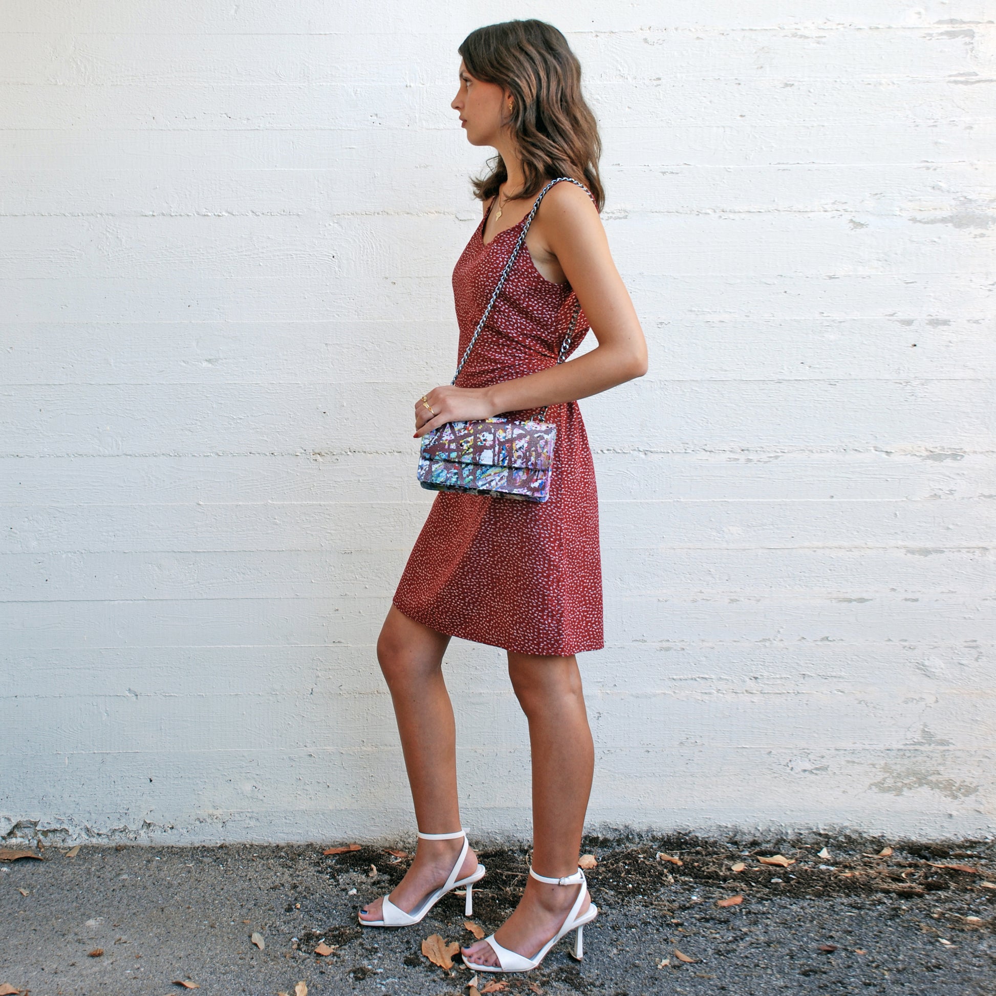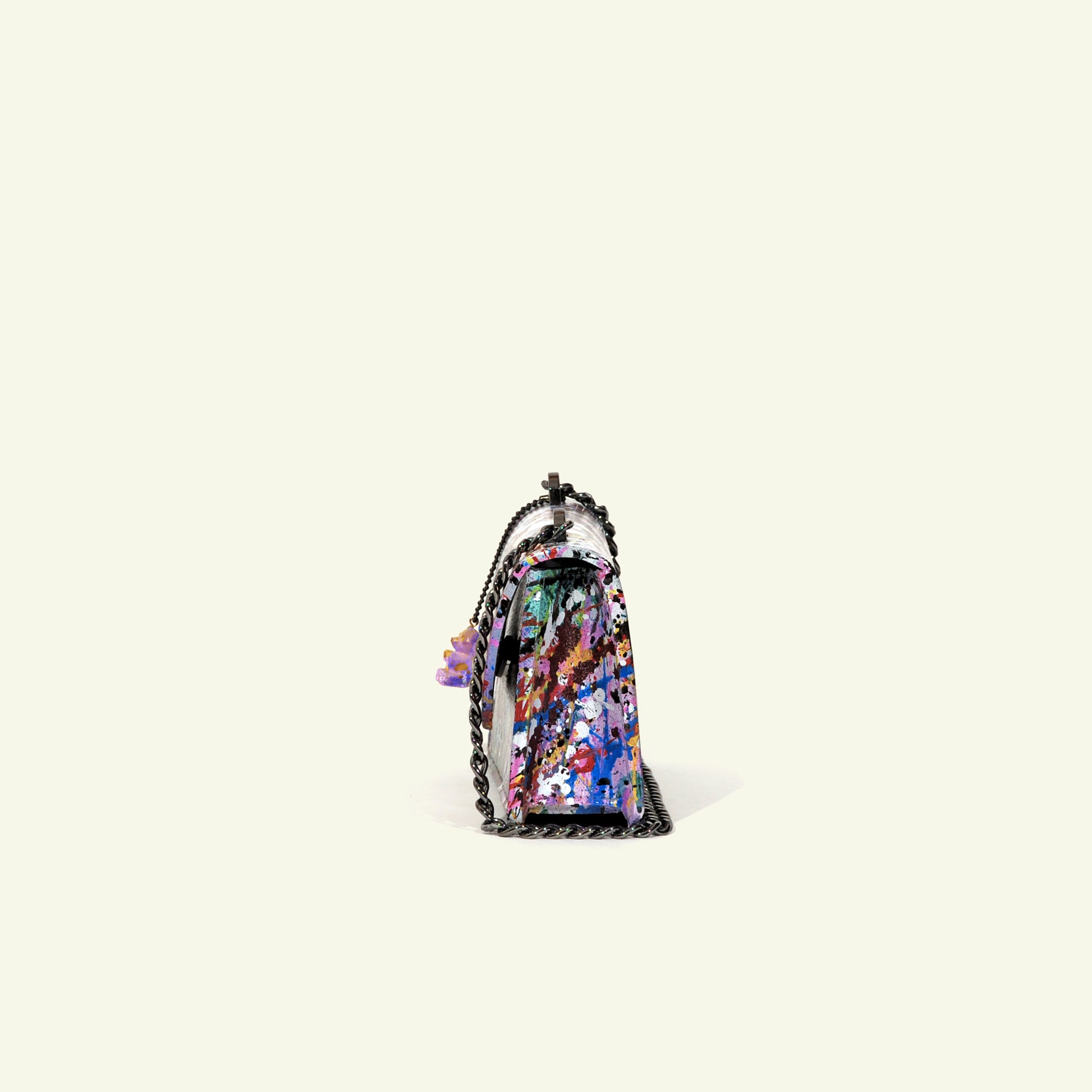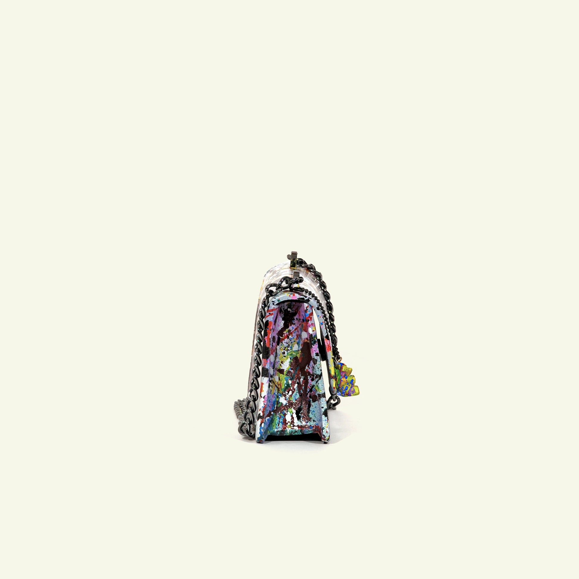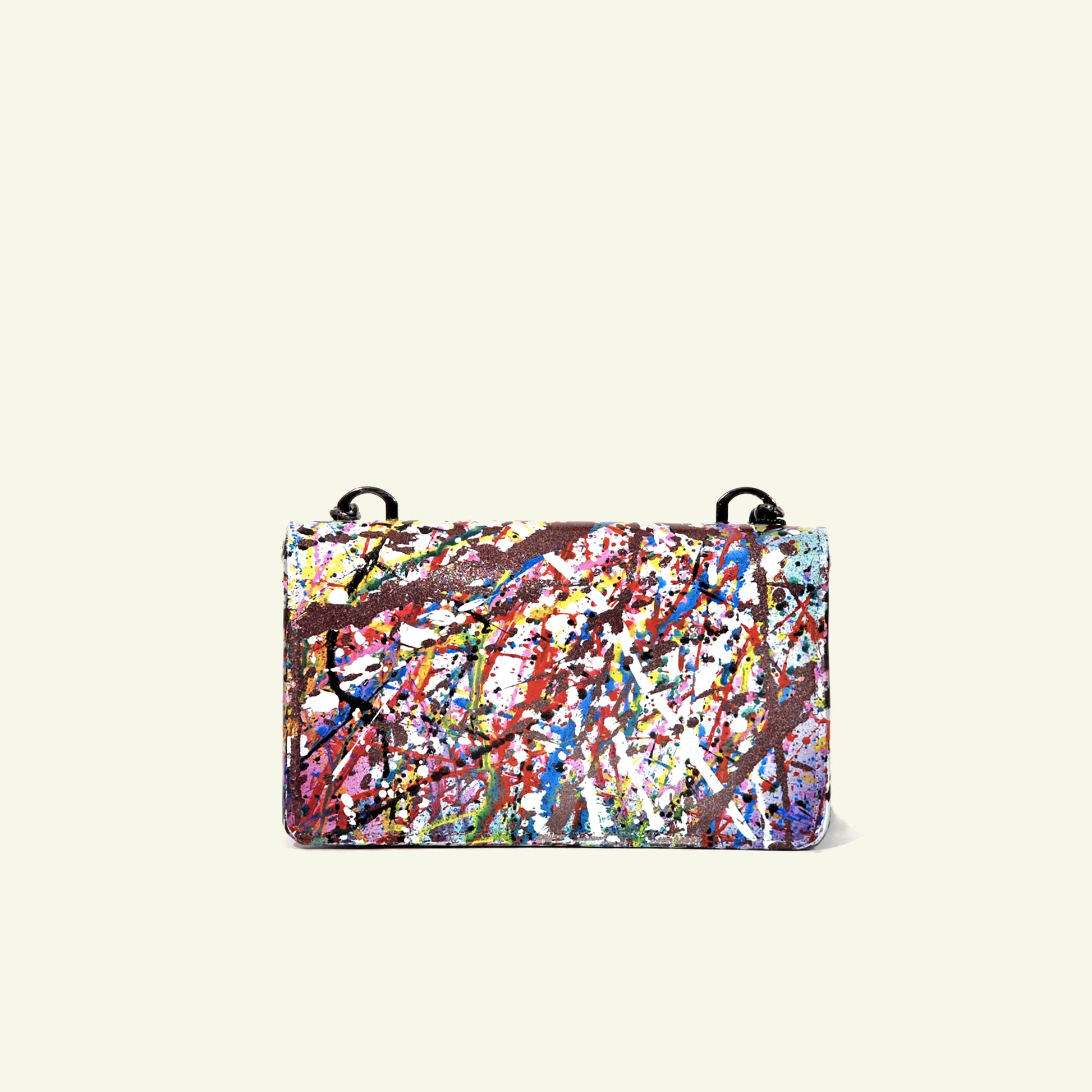 Realizzata in pelle aerografata a mano con stratificazioni multicolor, presenta una base bordeaux con dettagli metallici che esaltano la maestria artigianale dell’aerografia, trasformando ogni borsa in un pezzo d’arte contemporanea da indossare.