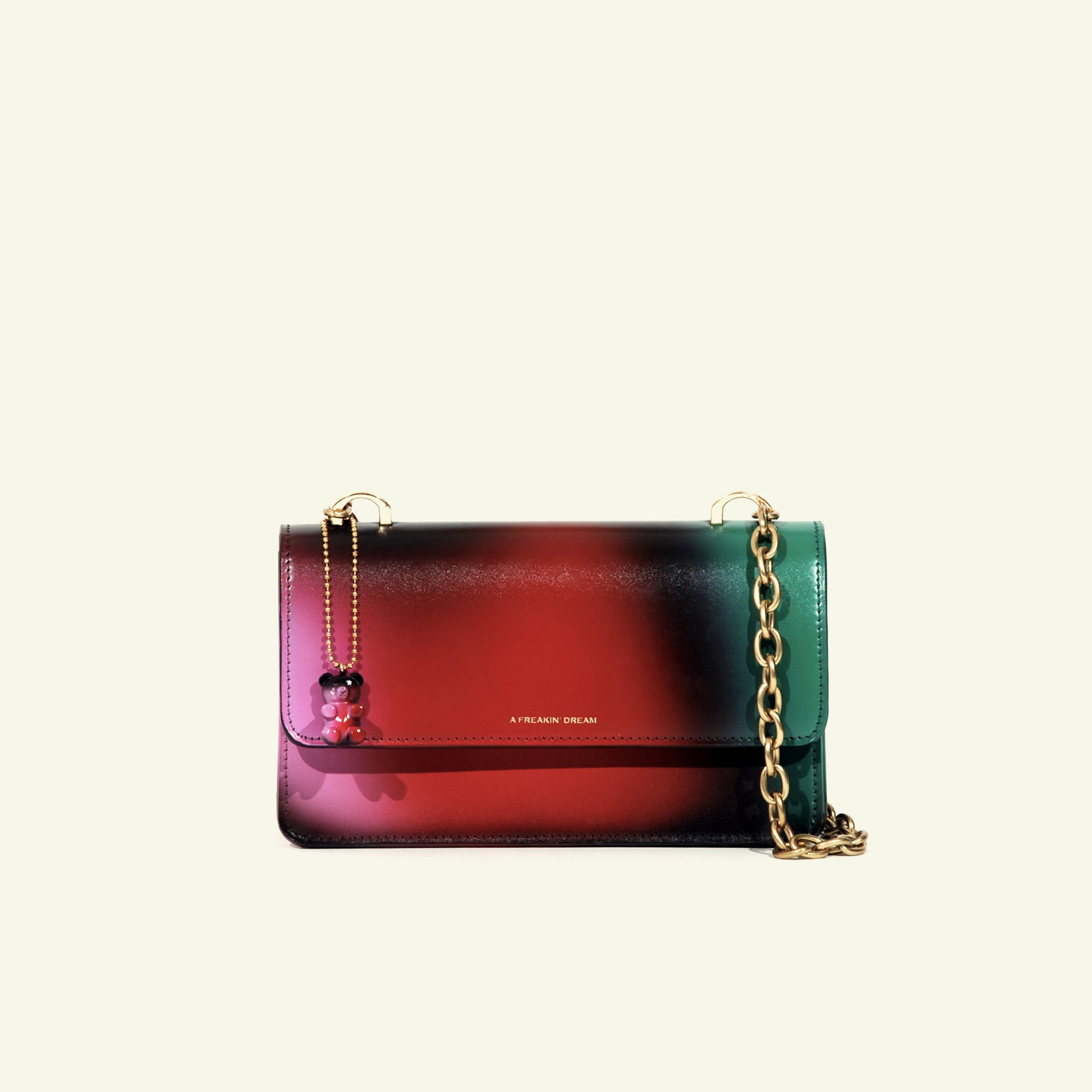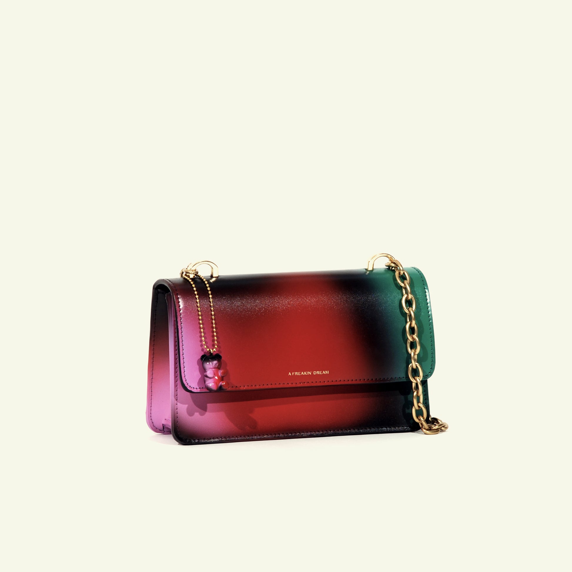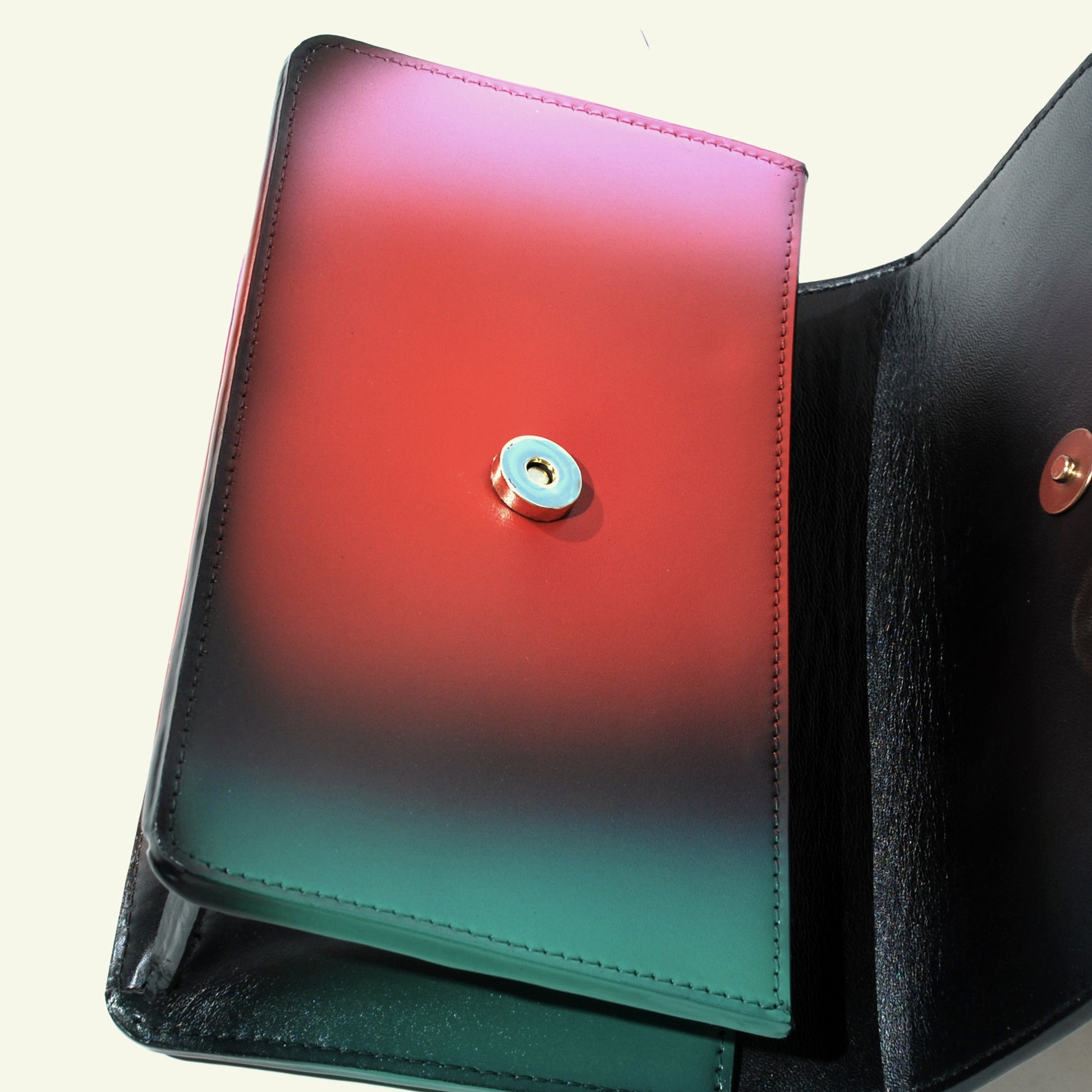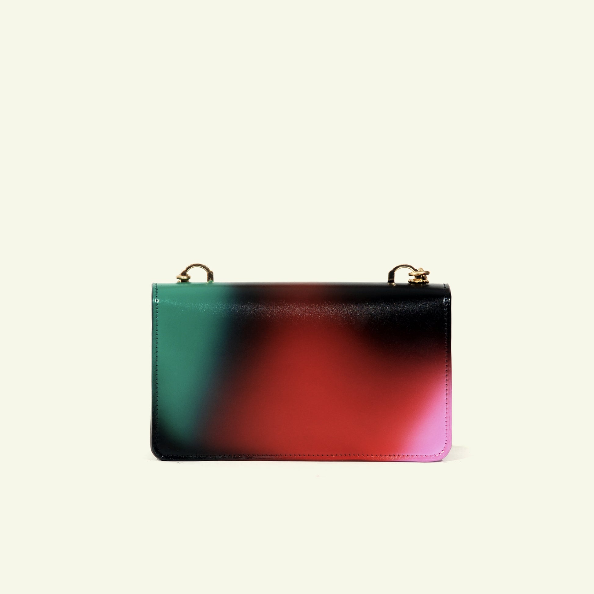 The Brenda Bag in “Colors Match Black” is a single-compartment bag with flap, press-button closure, and chain strap. Crafted in airbrushed black leather with soft pink, green, and red gradients, the hand-applied airbrush finish gives each bag a unique artistic depth.