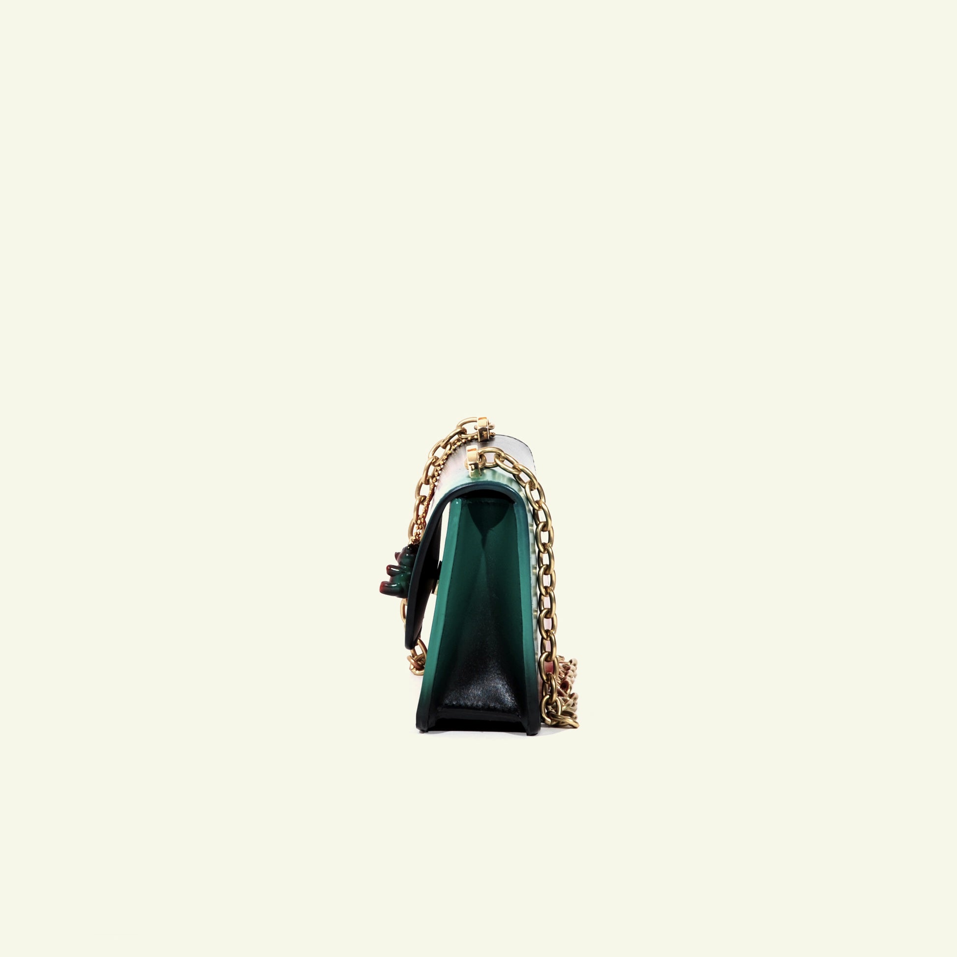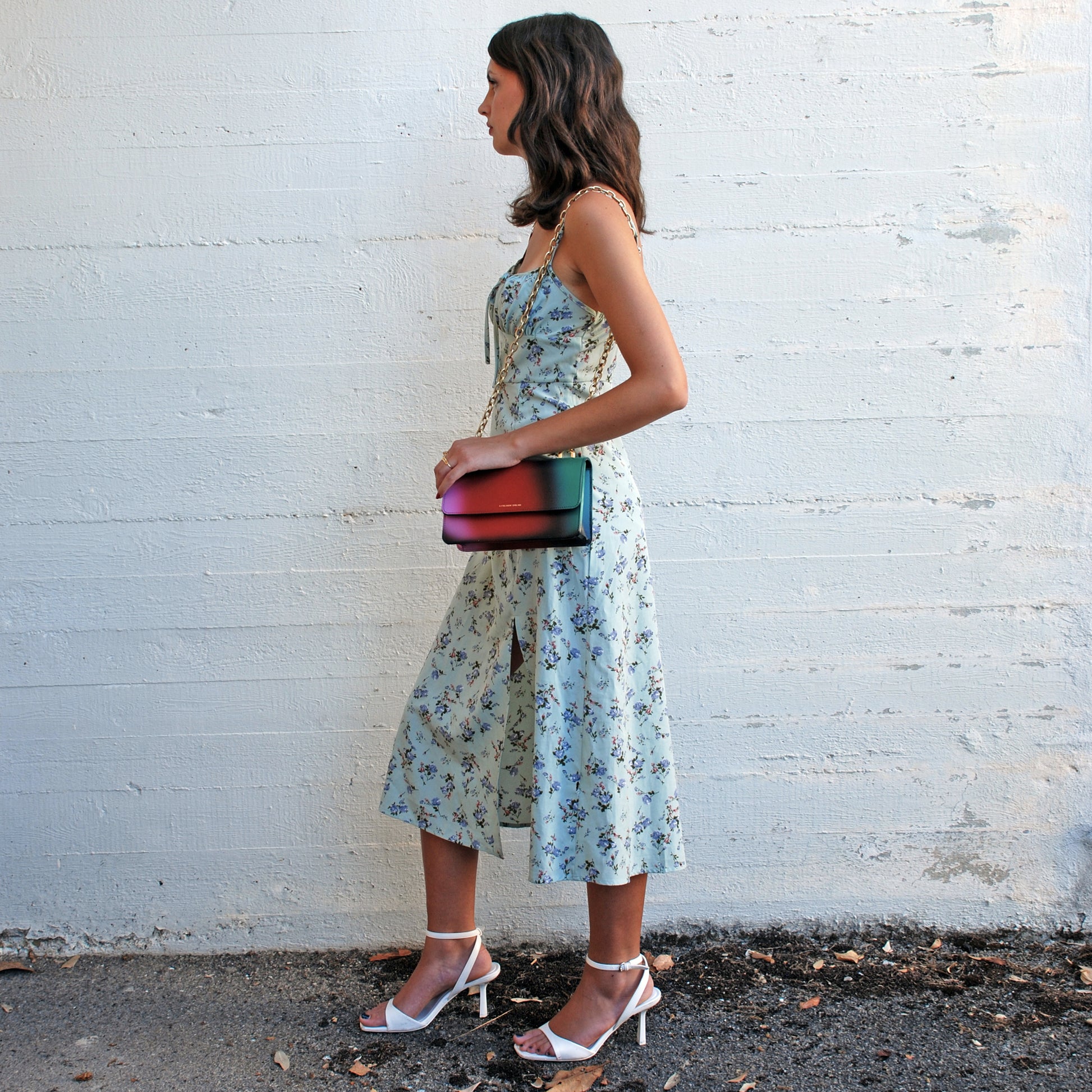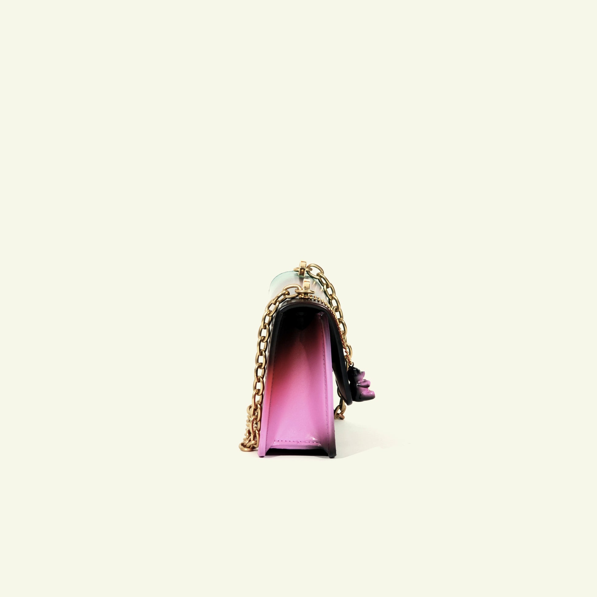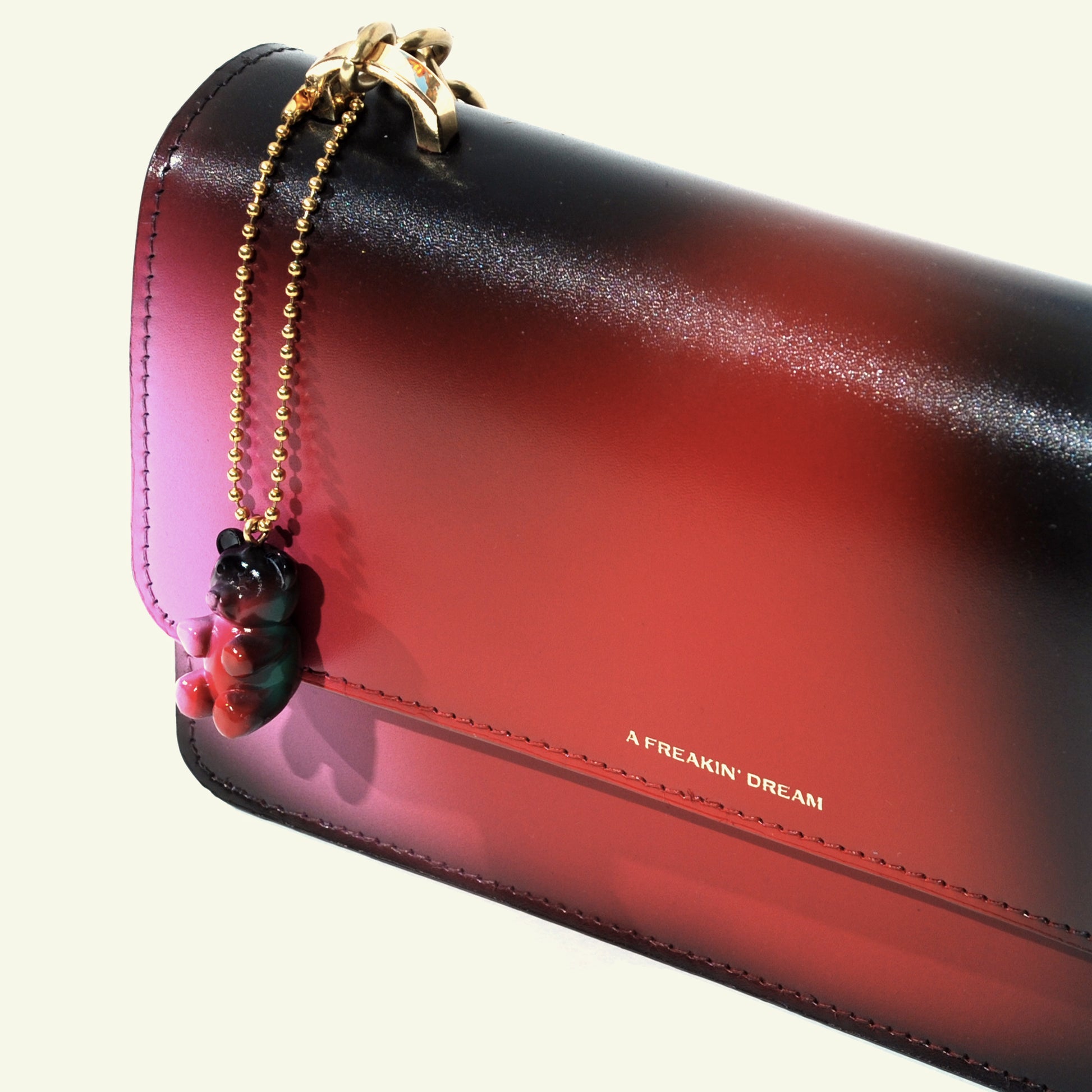 The Brenda Bag in “Colors Match Black” is a single-compartment bag with flap, press-button closure, and chain strap. Crafted in airbrushed black leather with soft pink, green, and red gradients, the hand-applied airbrush finish gives each bag a unique artistic depth.