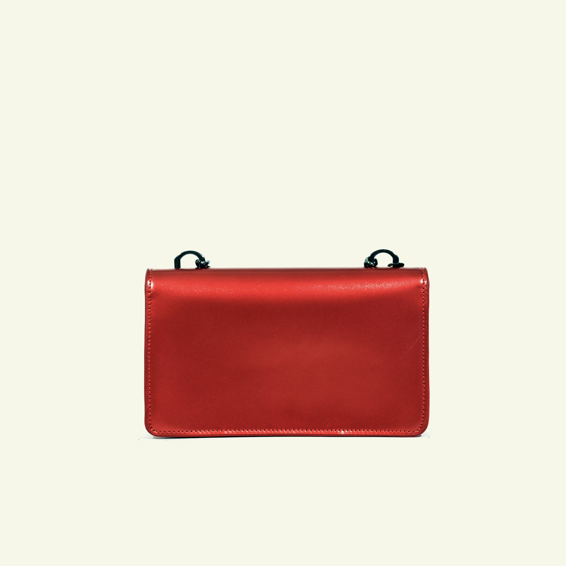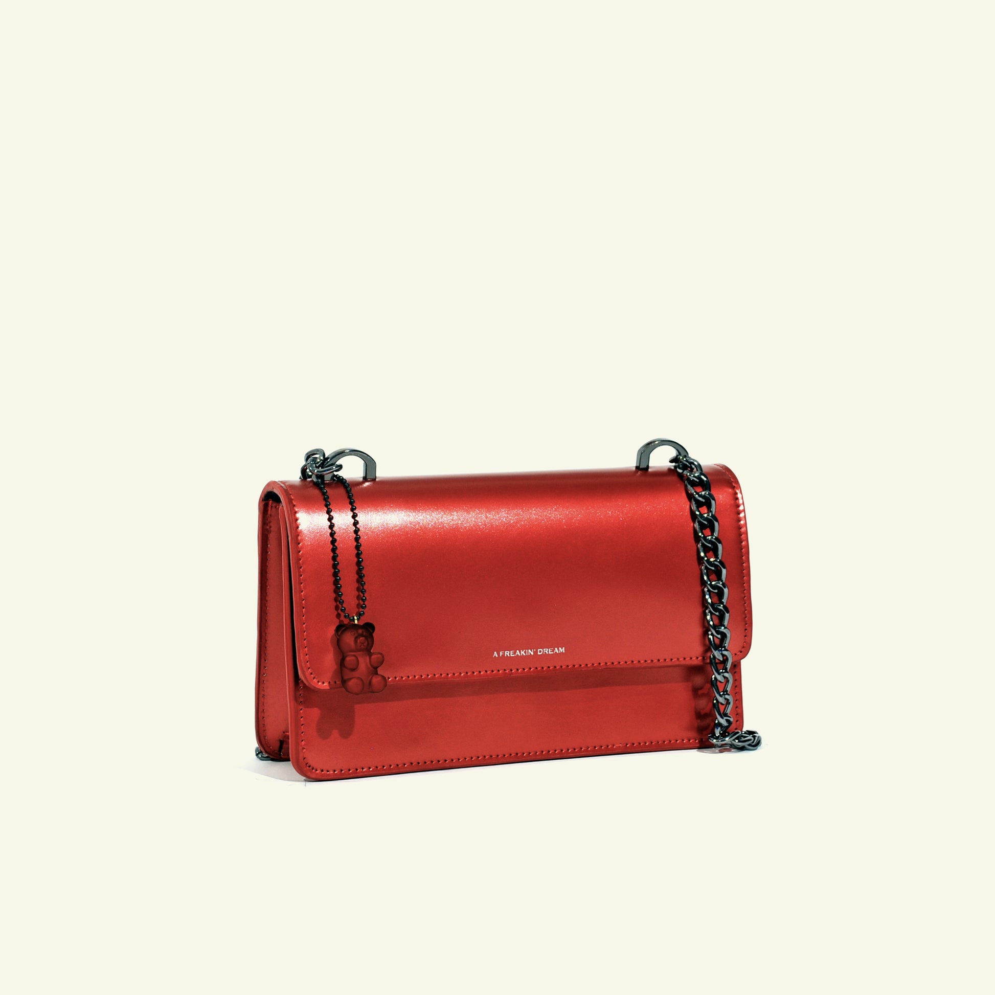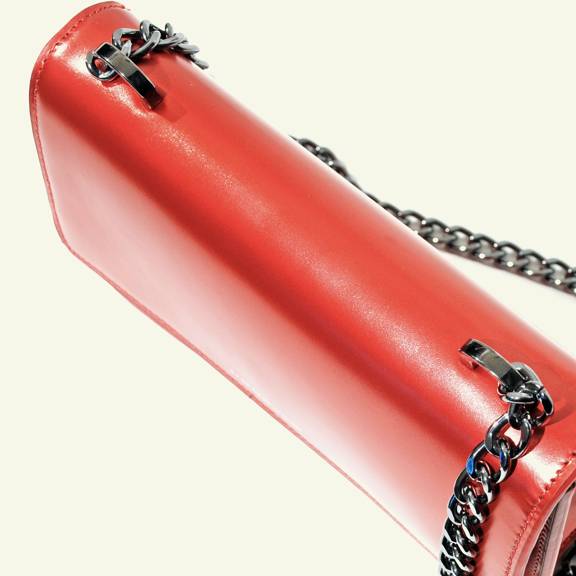 The Brenda Bag in “Flame Red” is a statement accessory in vibrant metallic red leather, achieved through hand-applied airbrushing. Its structured single-compartment design with flap and chain strap combines boldness and refinement, making everyday style feel extraordinary.