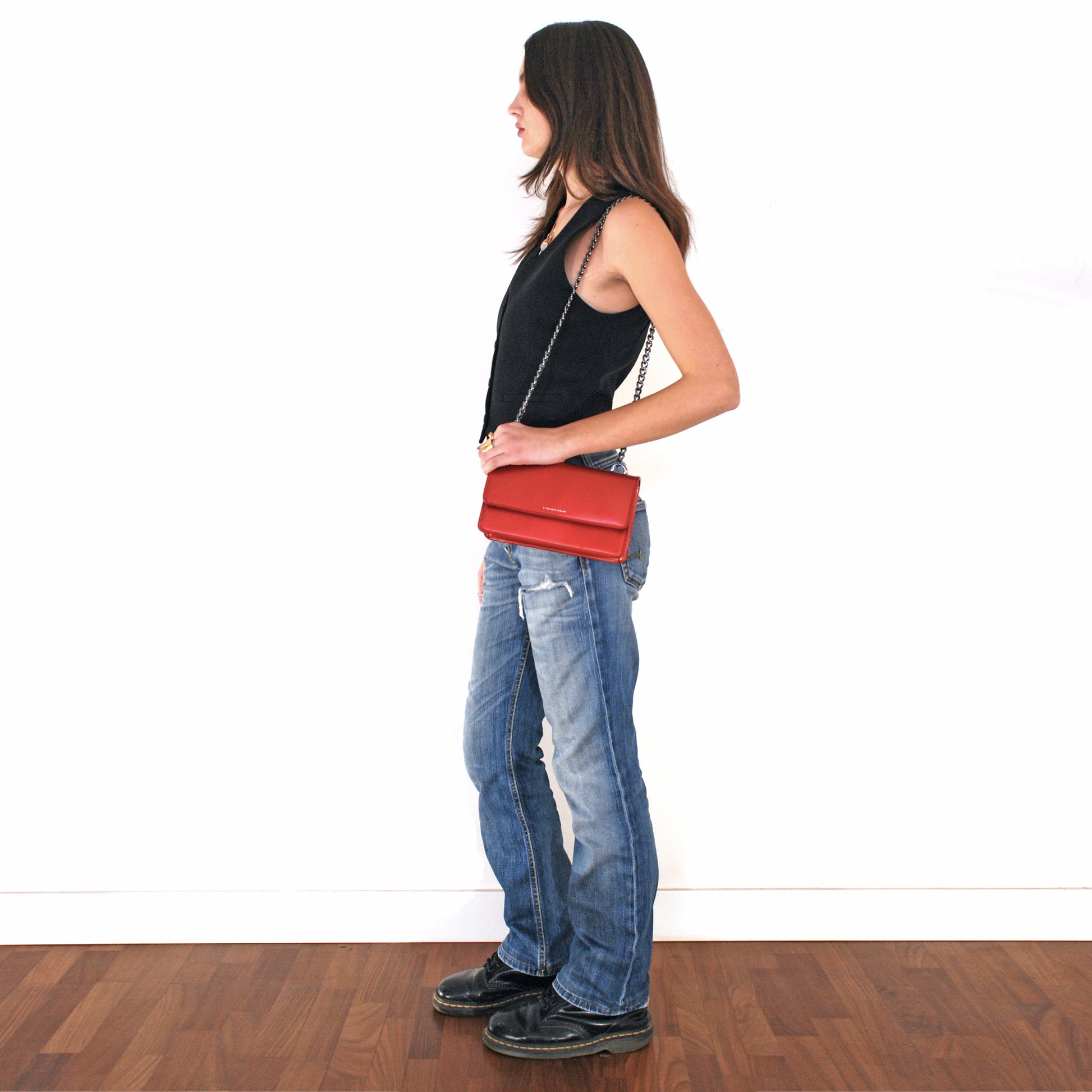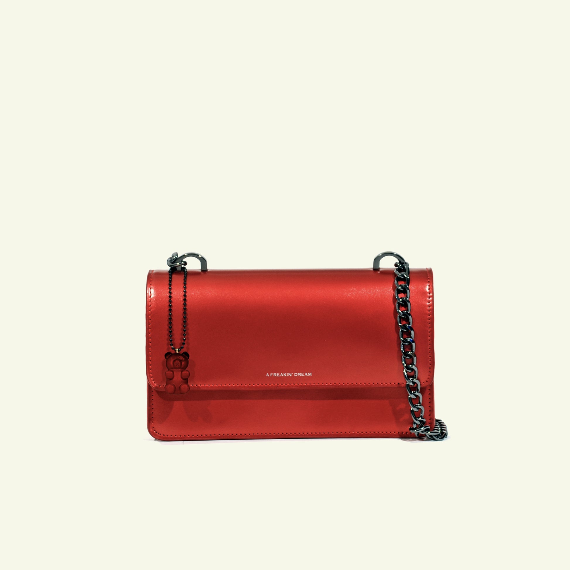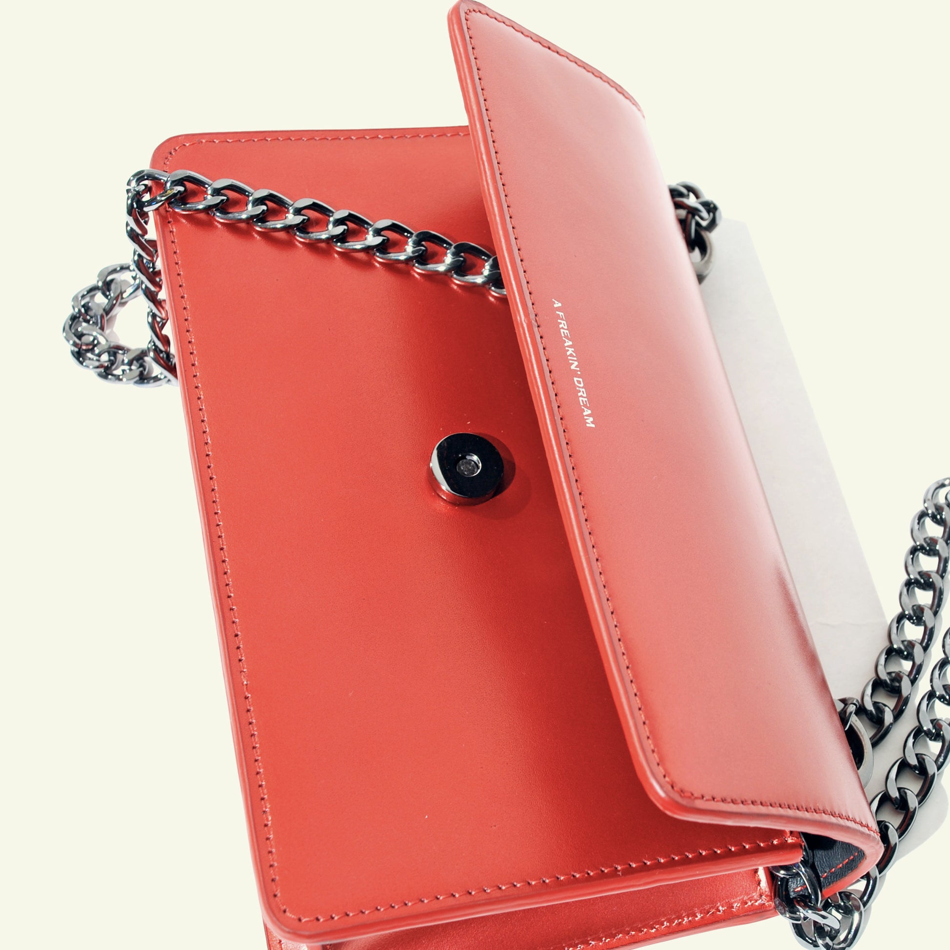 The Brenda Bag in “Flame Red” is a statement accessory in vibrant metallic red leather, achieved through hand-applied airbrushing. Its structured single-compartment design with flap and chain strap combines boldness and refinement, making everyday style feel extraordinary.