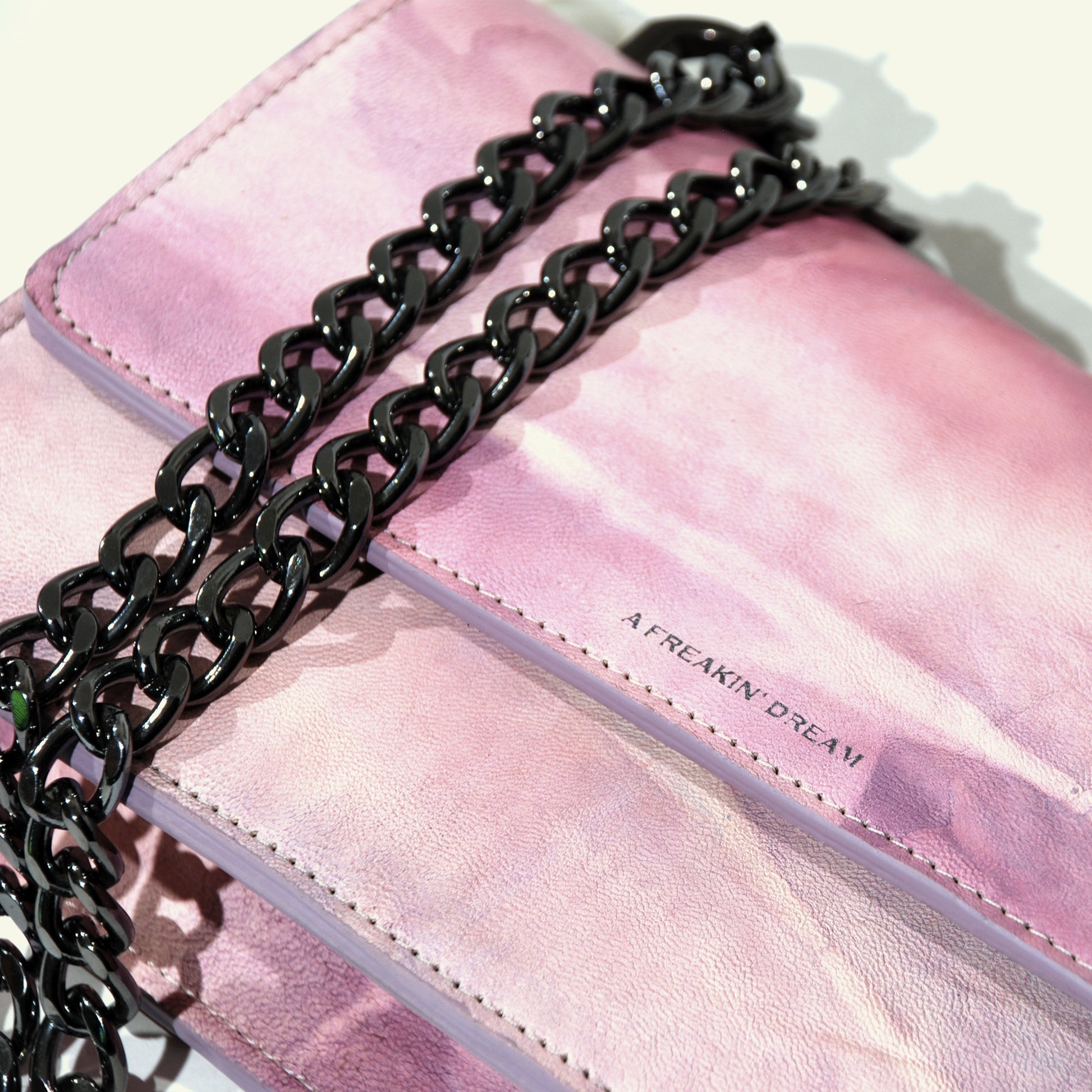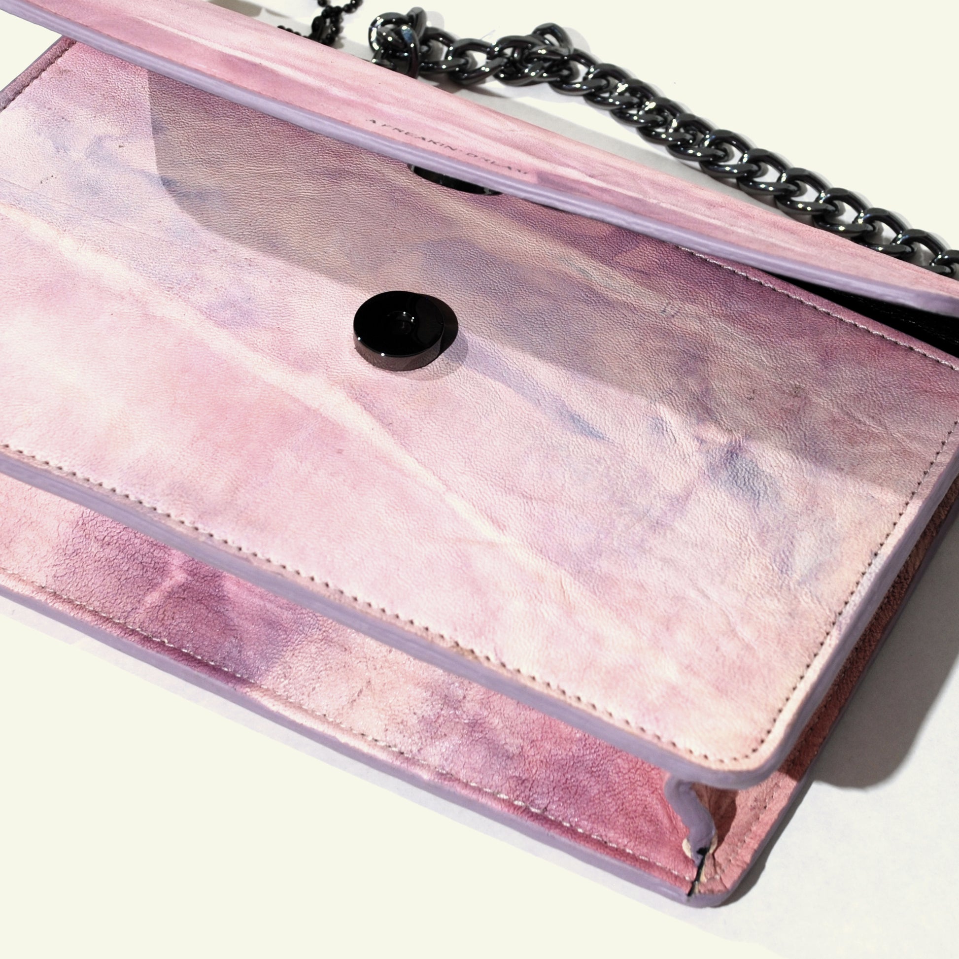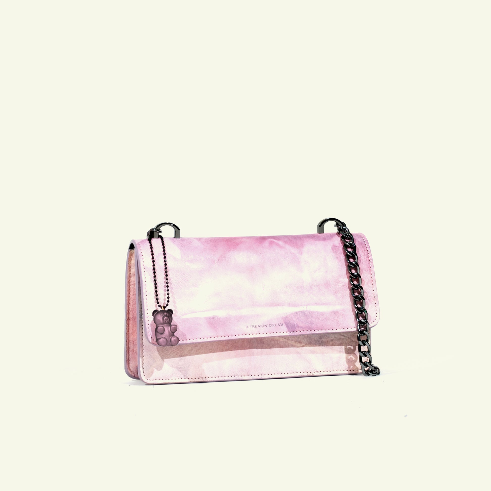 The Brenda Bag in “Skin Tie-Dye” features soft pink tones blended in a hand-airbrushed tie-dye effect. Its single-compartment design with flap and chain strap brings an artistic, light touch to everyday elegance.
