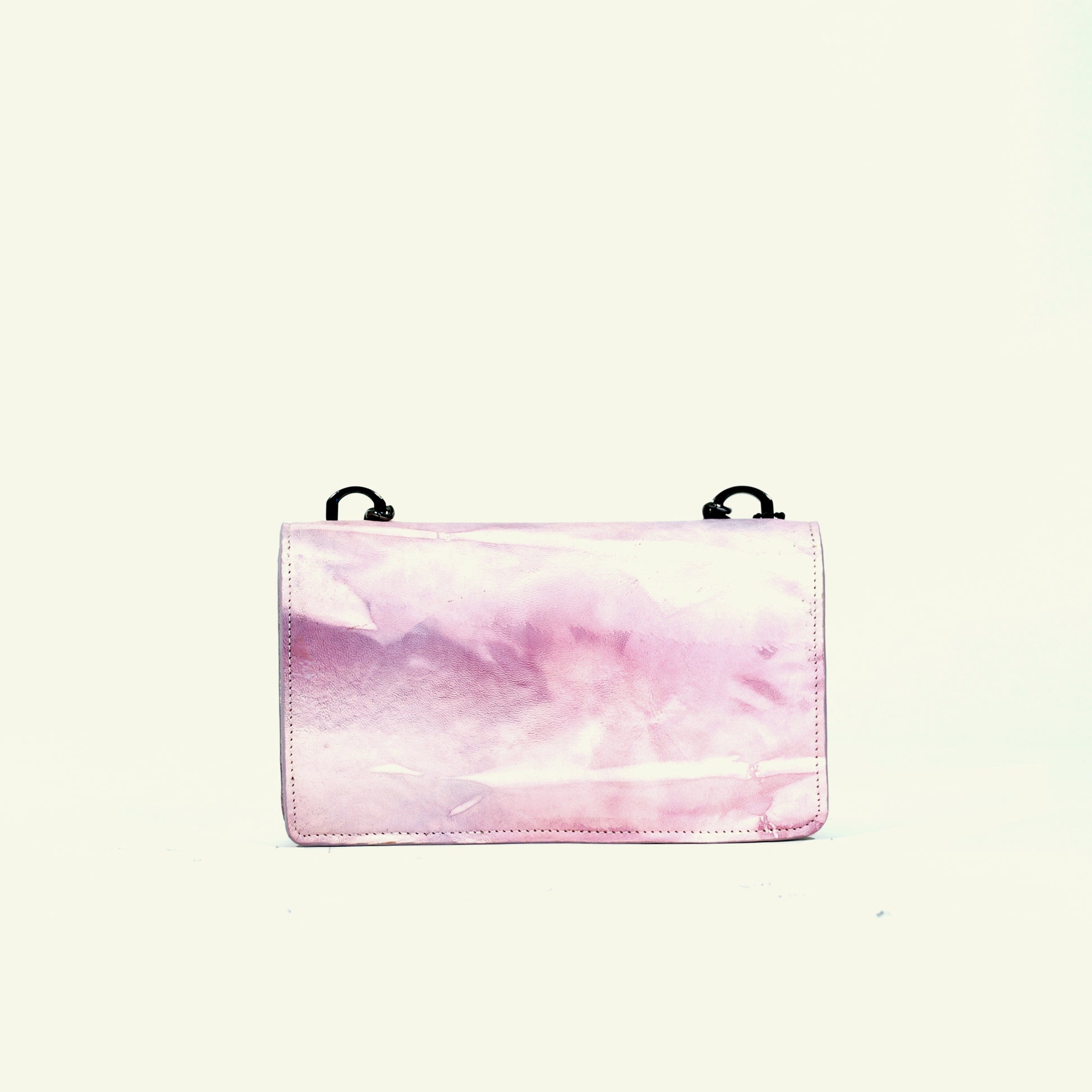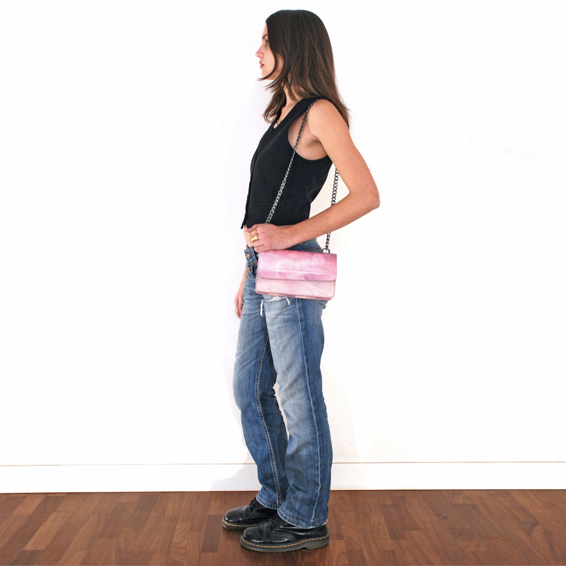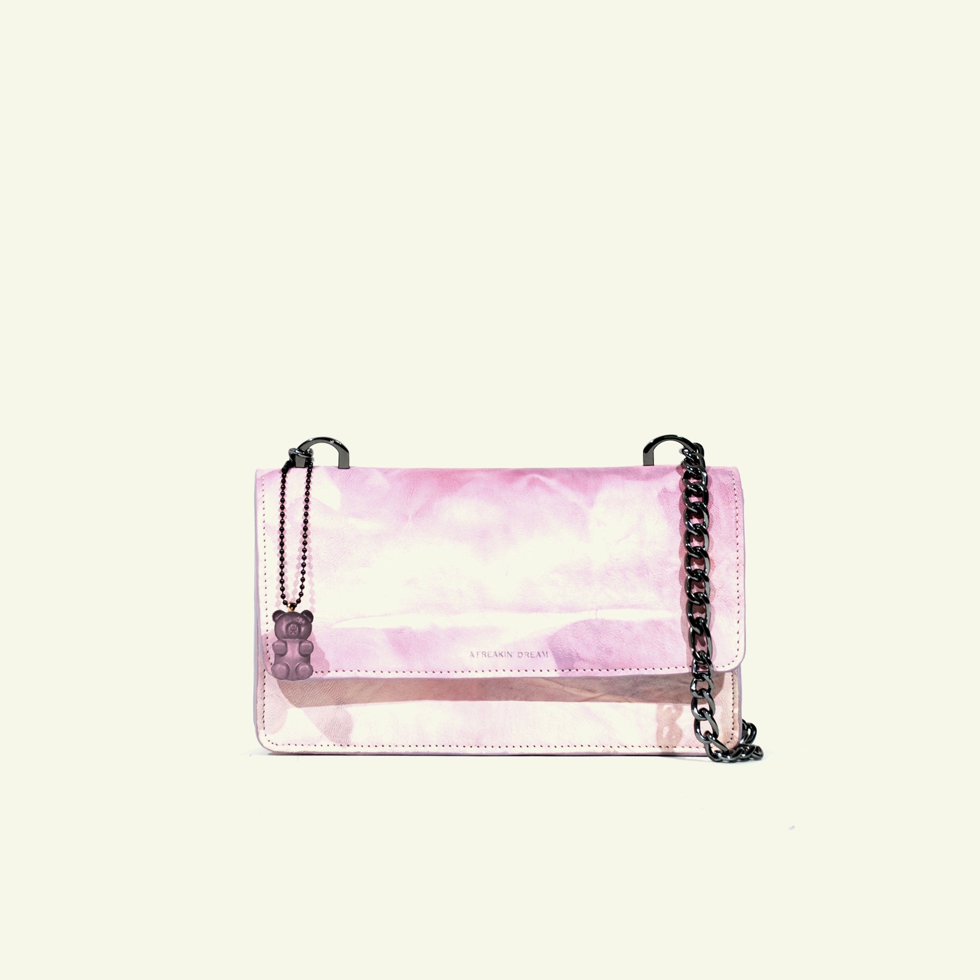 The Brenda Bag in “Skin Tie-Dye” features soft pink tones blended in a hand-airbrushed tie-dye effect. Its single-compartment design with flap and chain strap brings an artistic, light touch to everyday elegance.