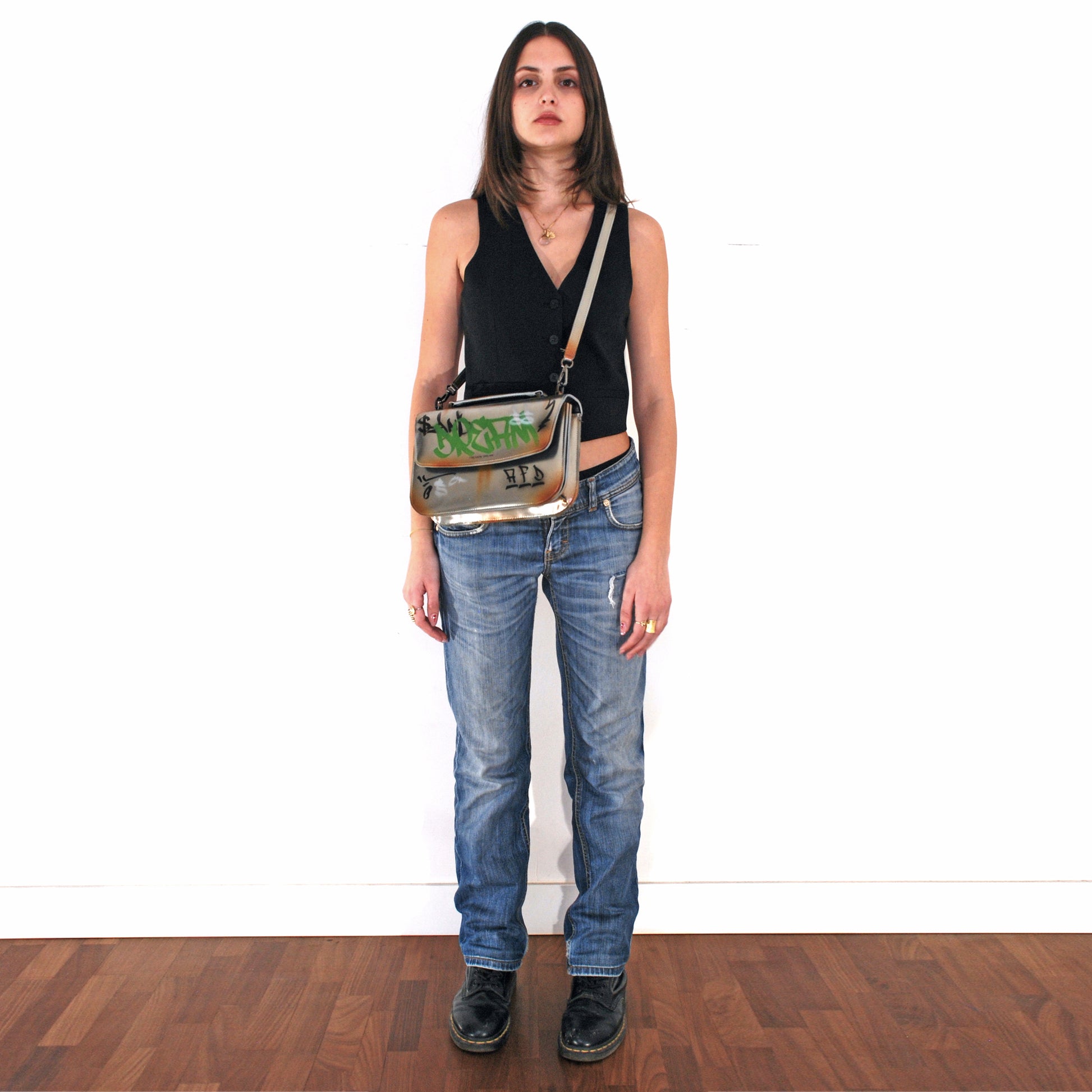 The Tori Bag in “Chrome Drop” is where sculptural elegance meets urban art. Handcrafted in Florence, this versatile bag can be worn as a shoulder bag, crossbody, or carried by hand. The calfskin surface is meticulously airbrushed with bold graffiti-inspired artwork, echoing the same artistic energy of the Gia line.