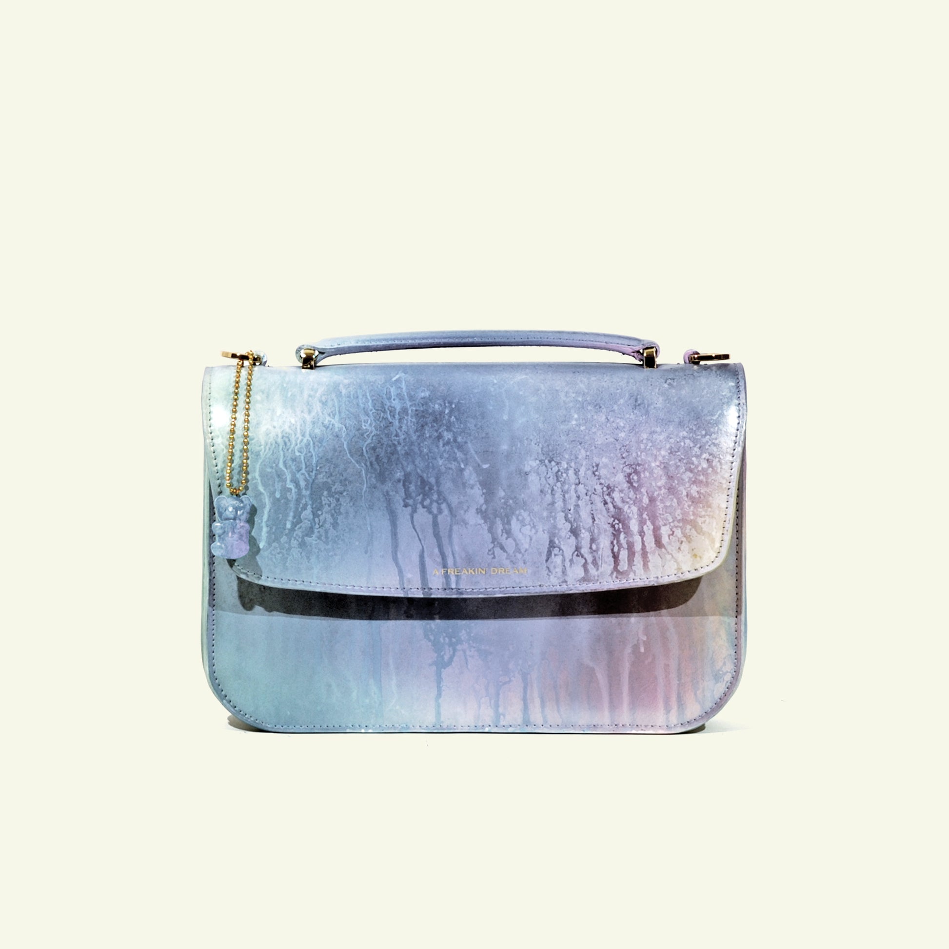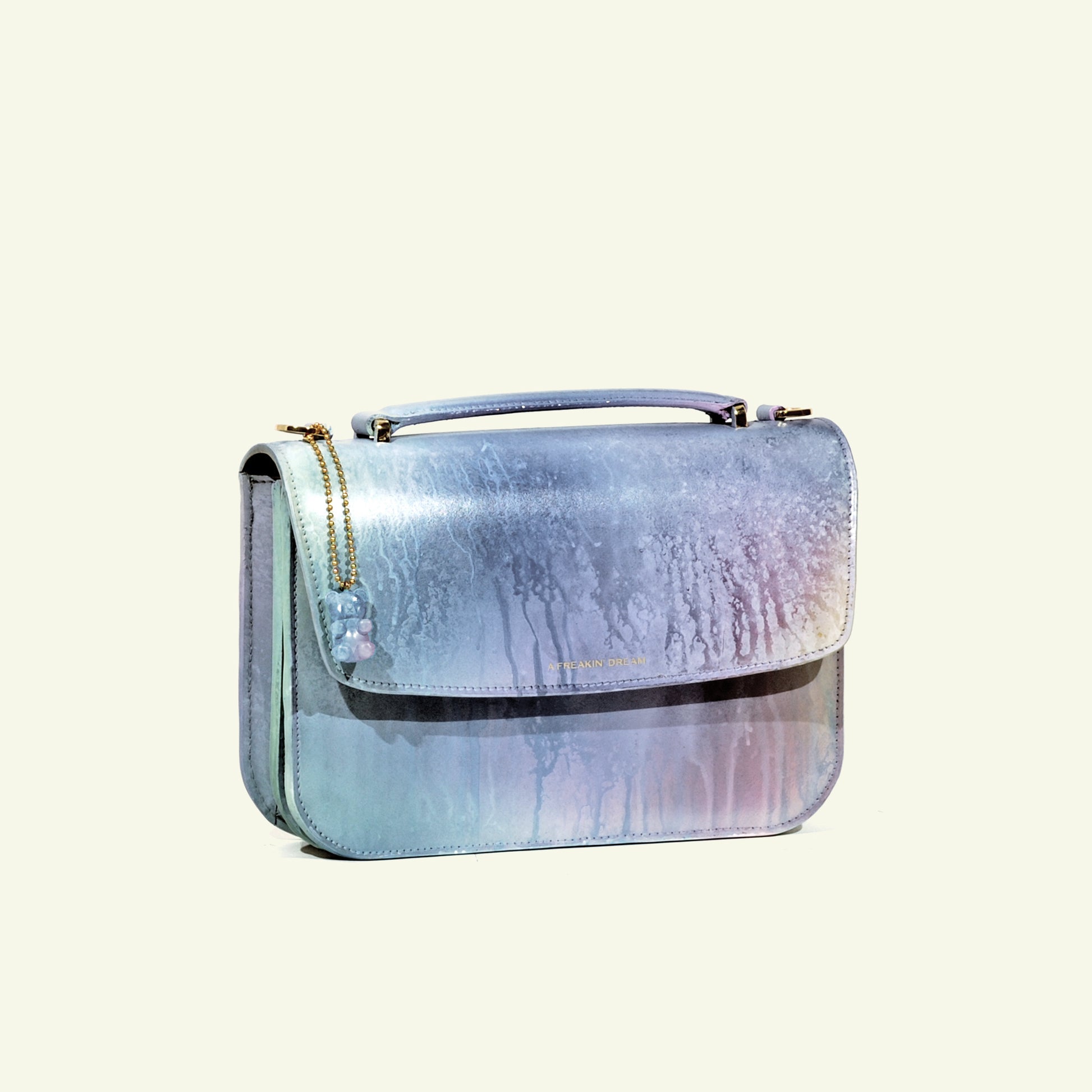 The Tori Bag in “Oops I Drop the Paint” is a fearless celebration of spontaneity. Crafted in Florence from smooth calfskin, its surface is treated with an airbrushed finish that mimics spilled paint, turning accidental beauty into wearable art.
