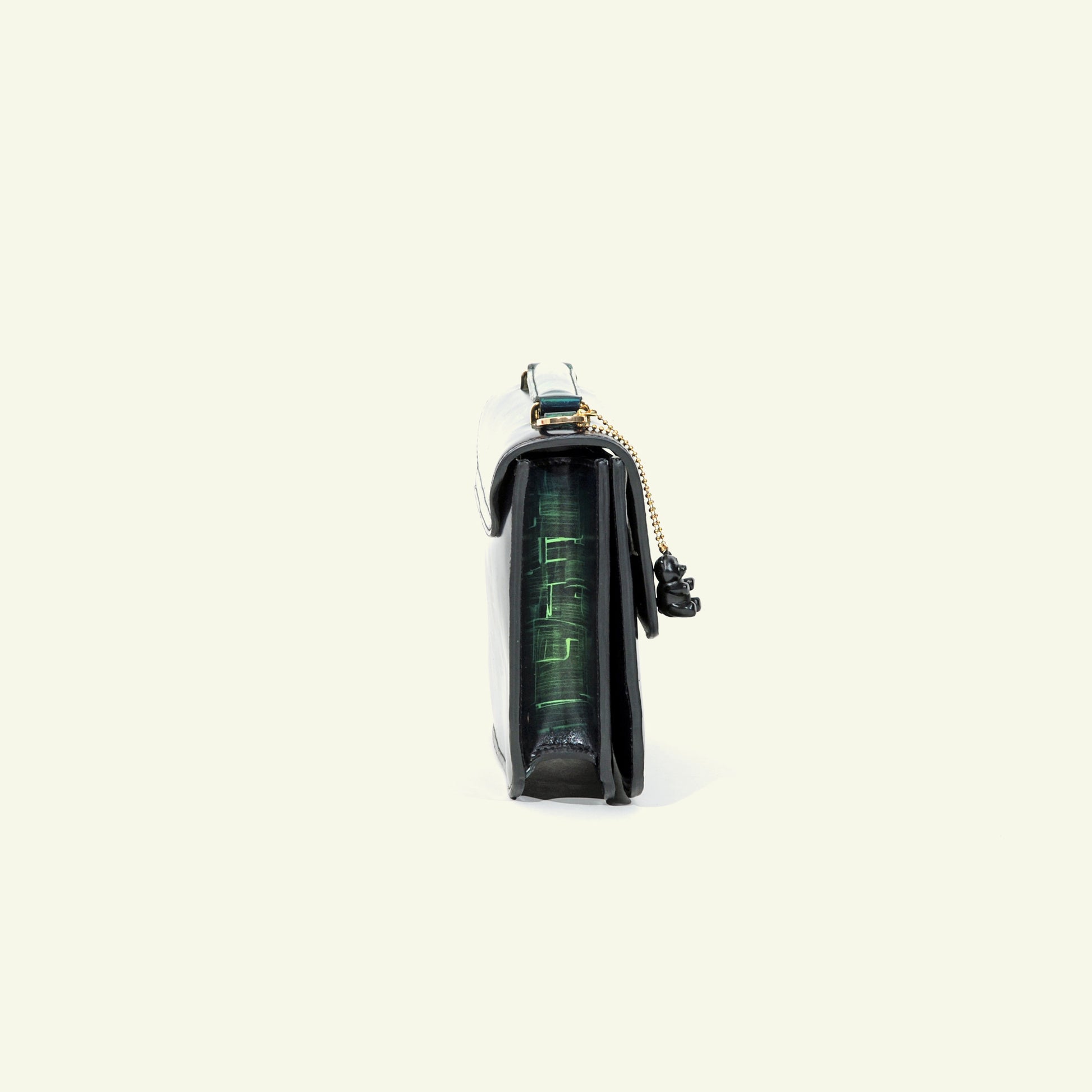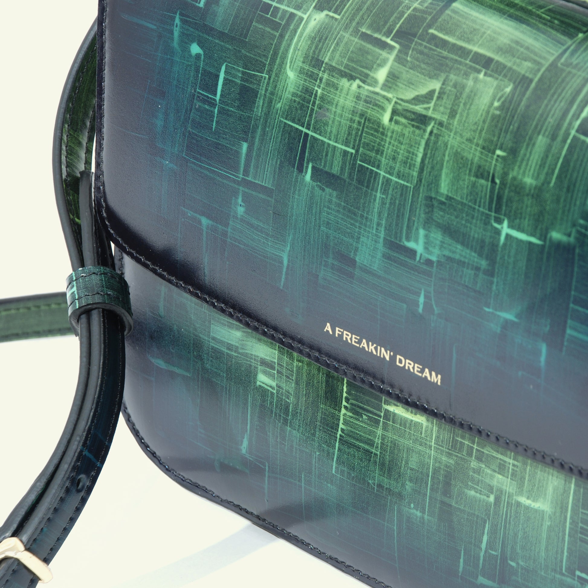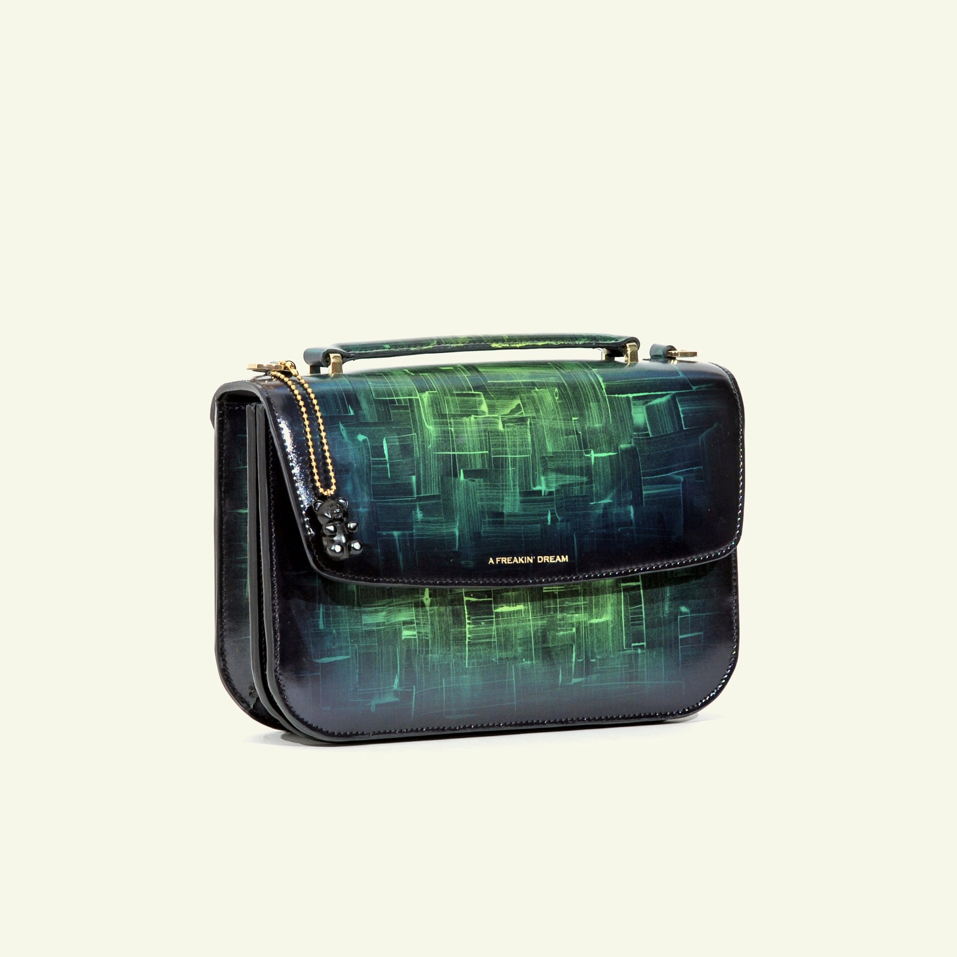 The Tori Bag in “Our Own Bouclé – Green” brings an innovative approach to surface design, with airbrushed effects that recreate the look of bouclé fabric in deep, shifting green tones.