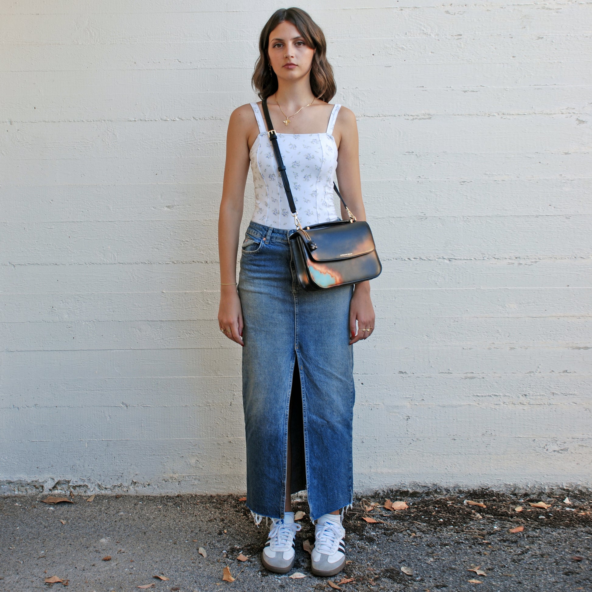 The Tori Bag in “Rust” channels industrial poetry with an organic edge. Handcrafted from calfskin in Florence, the surface is airbrushed to mimic oxidized metal tones, blending warm rust with striking green copper details.