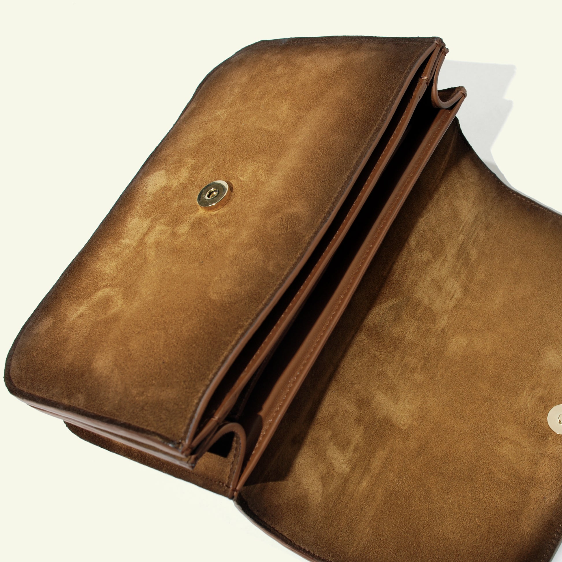 The Tori Bag in “Burnt Wheat” celebrates organic warmth and tactile richness. Handcrafted from premium suede in Florence, its surface is airbrushed in deep golden-brown hues that evoke the texture and depth of scorched earth.